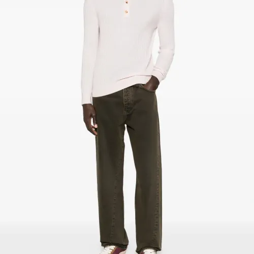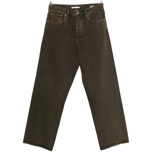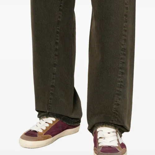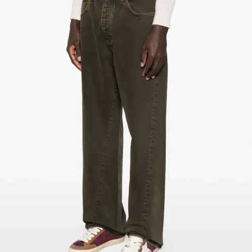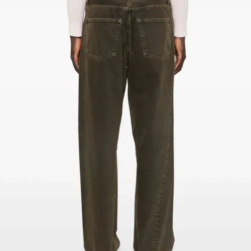 темно-коричневый с эффектом выварки, пять карманов, застежка на пуговицу, шлевки для ремня, тональная отделка строчкой, прямой крой