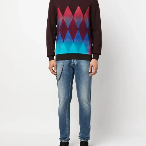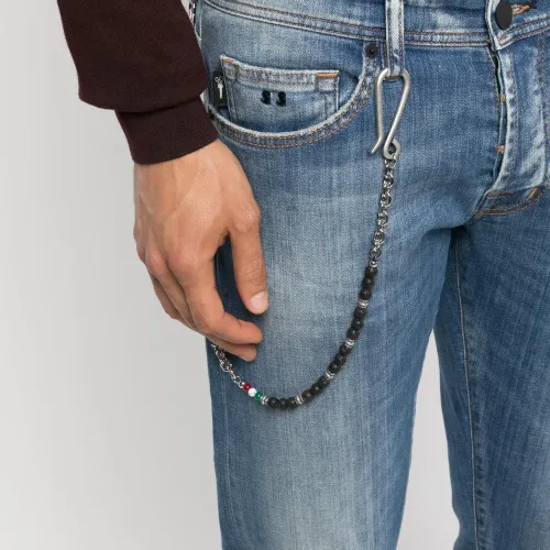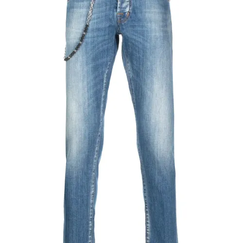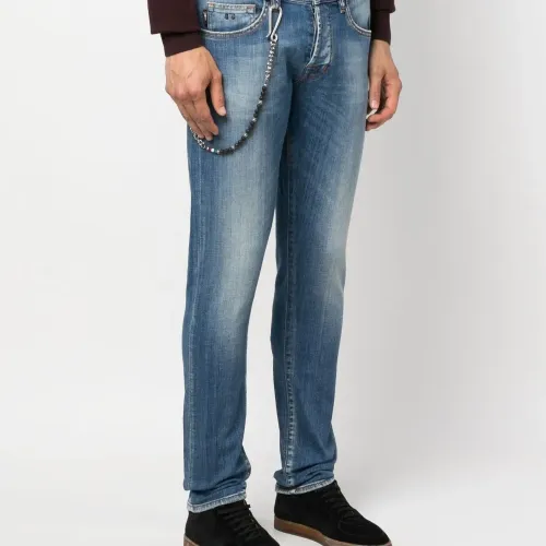 Синий, эластичный хлопок, цепочка, эффект потертости, низкая посадка, петли для ремня, застежка на молнии и пуговице спереди, пять карманов и прямой крой.