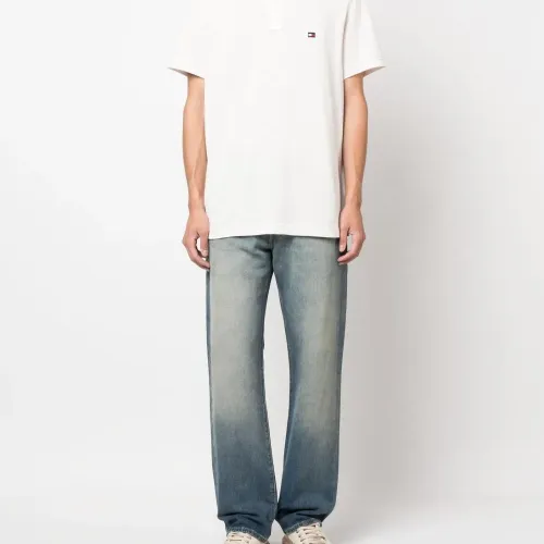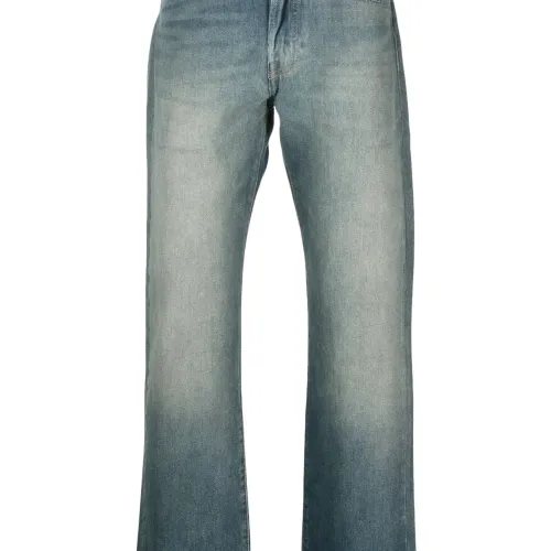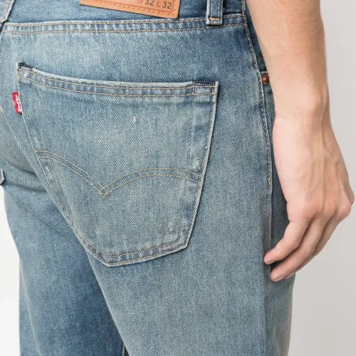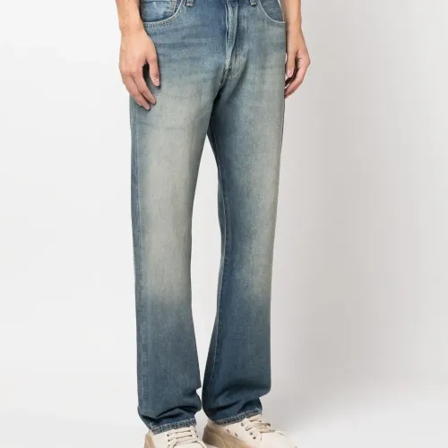 Индиго, хлопок, деним, эффект потертости, потайная застежка на молнии и пуговицах, пять карманов, петли для ремня, прямой крой и прямой подол.