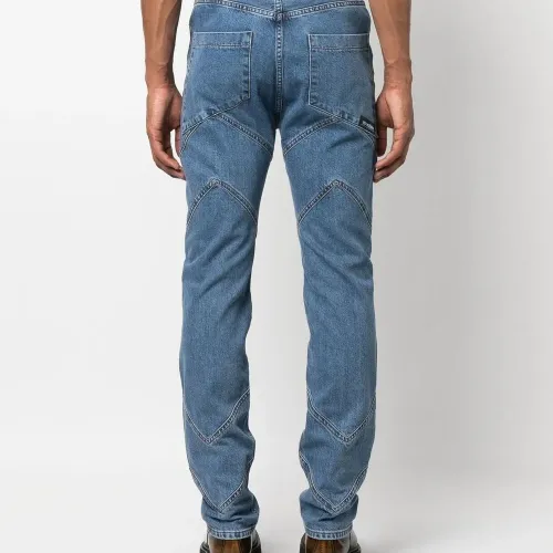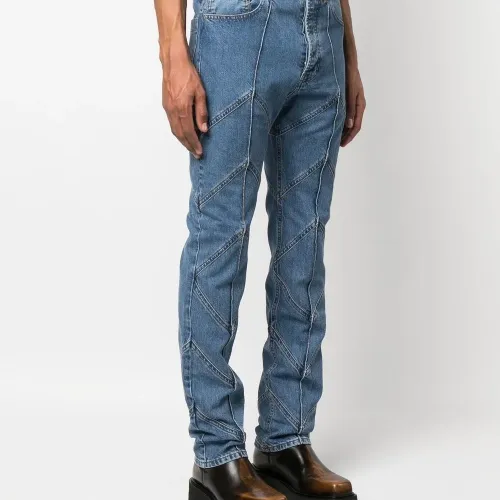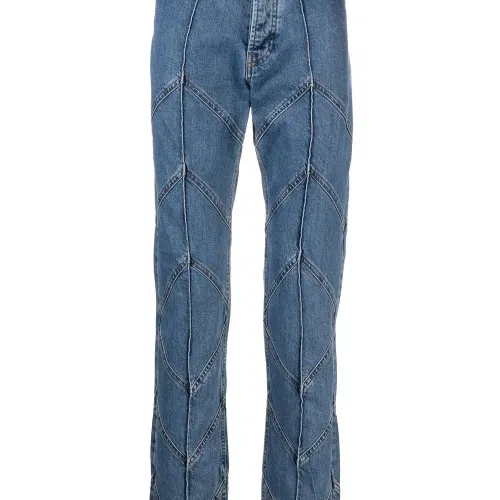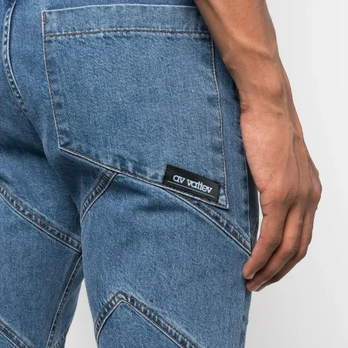 Синий, хлопок, обработанный деним, петли для ремня, застежка на молнии и пуговице спереди, пять карманов и прямой крой.