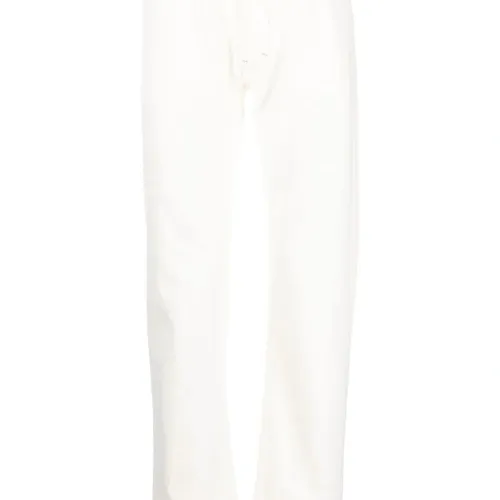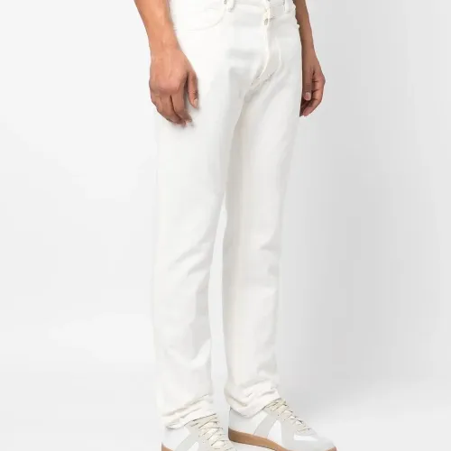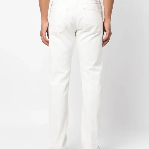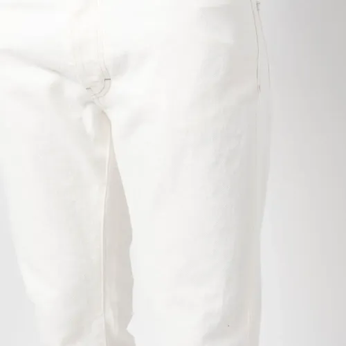 Белый, органический хлопок, нашивка с логотипом сзади, петли для ремня, ширинка на пуговицах, пять карманов и узкий крой. Ответственный выбор: