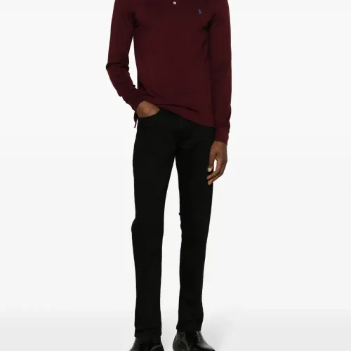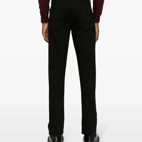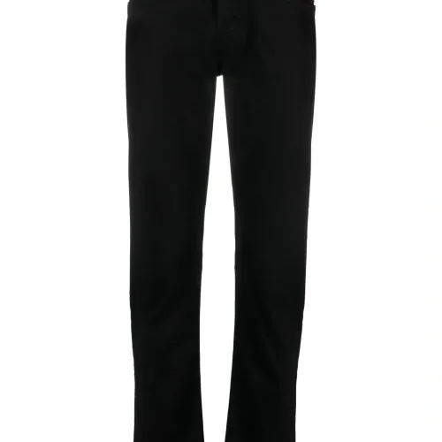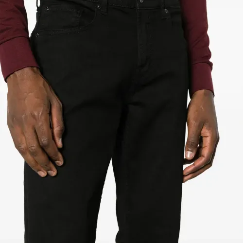 Черный, смесовый хлопок, деним, нашивка с логотипом сзади, петли для ремня, застежка на молнии и пуговице спереди, средняя посадка, узкий крой и пять карманов.