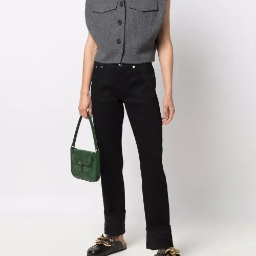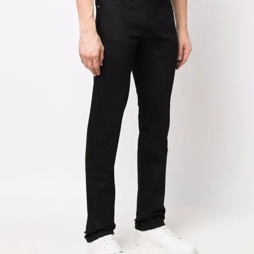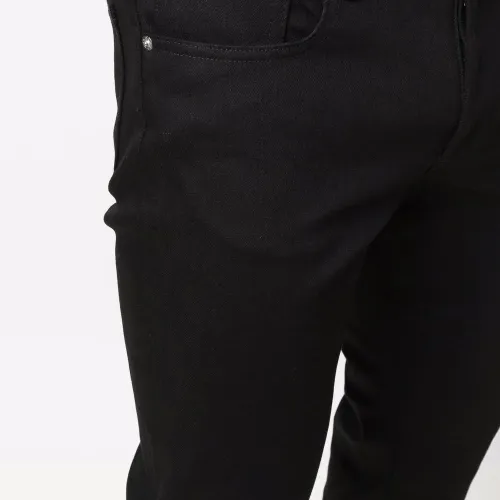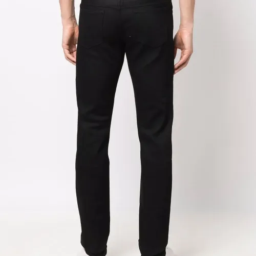 Средняя посадка, петли для ремня, ширинка на пуговицах, классическая пятикарманная модель и узкий крой. Цвет: черный.