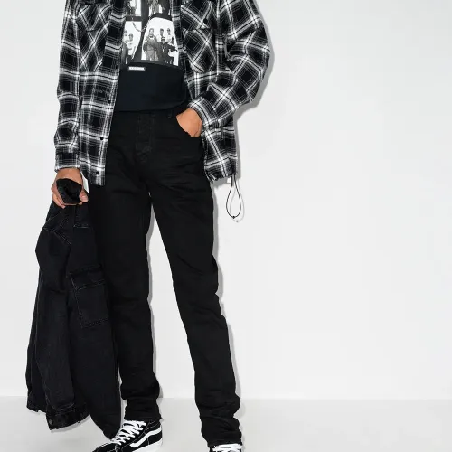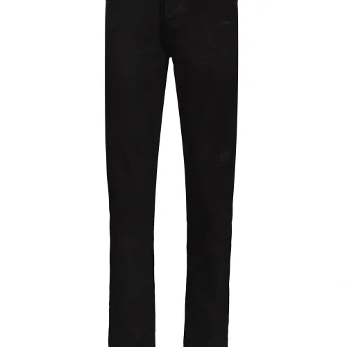 Облегающий крой, петли для ремня, застежка на пуговицах спереди и классическая пятикарманная модель. Цвет: черный.
