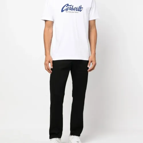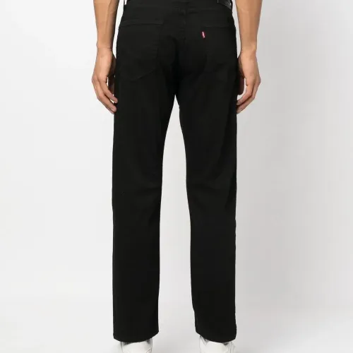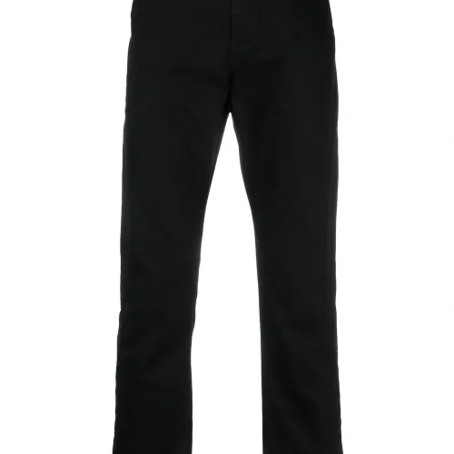 Черный, смесовый хлопок, нашивка с логотипом сзади, петли для ремня, застежка на пуговицах спереди, ширинка на молнии, пять карманов и зауженный крой.