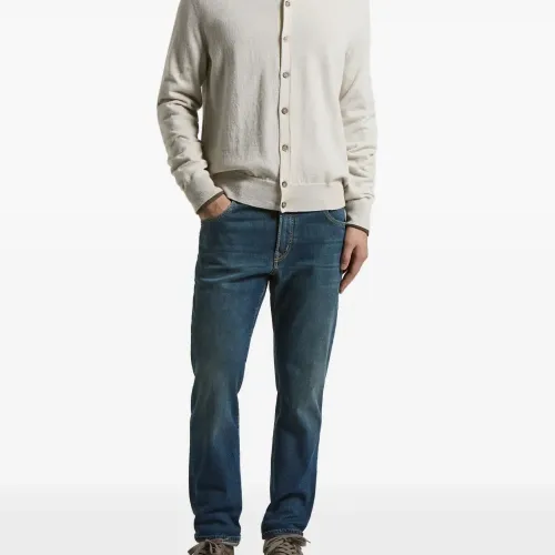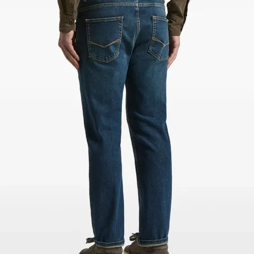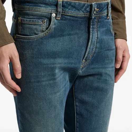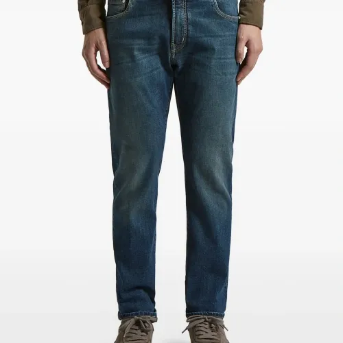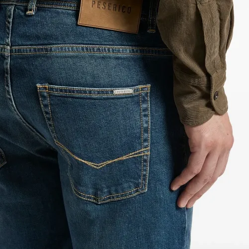 синие шлевки для ремня, пять карманов, нашивка с логотипом сзади, верхняя застежка на пуговицу, однотонная строчка