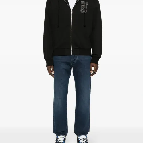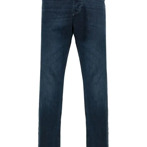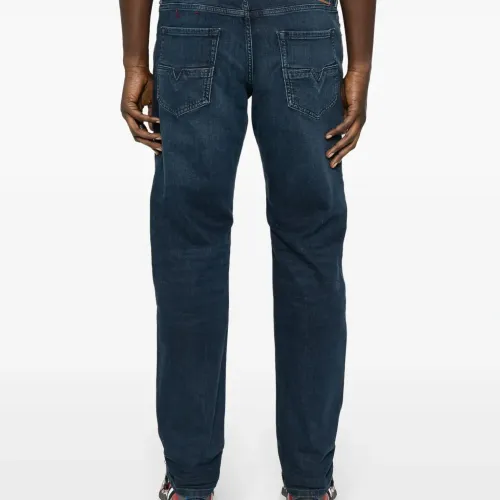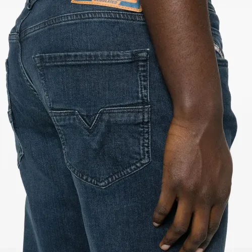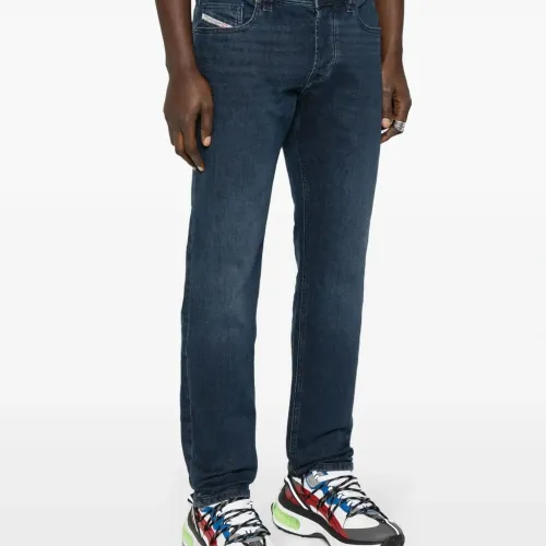 Индиго, эластичный хлопок, обработанный деним, декоративные складки на бедрах, вышитый логотип сбоку, нашивка с логотипом сзади, средняя посадка, петли для ремня, застежка на пуговицах спереди, пять карманов и зауженный крой.