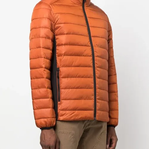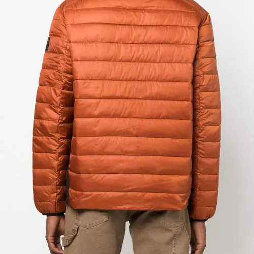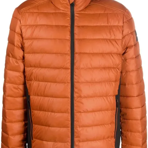 Дутый материал, нашивка с логотипом на рукаве, воротник-стойка, застежка на молнии спереди, длинные рукава и передние карманы на молнии.