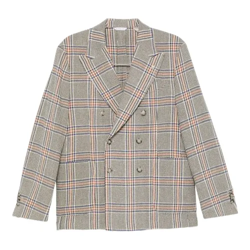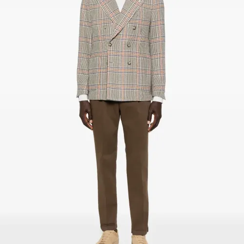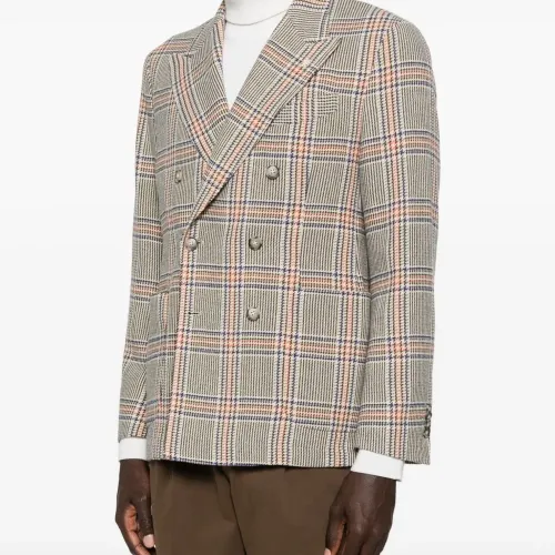 бежевый клетчатый узор двубортный застежка на пуговицы пиджачий воротник с заострёнными лацканами длинные рукава