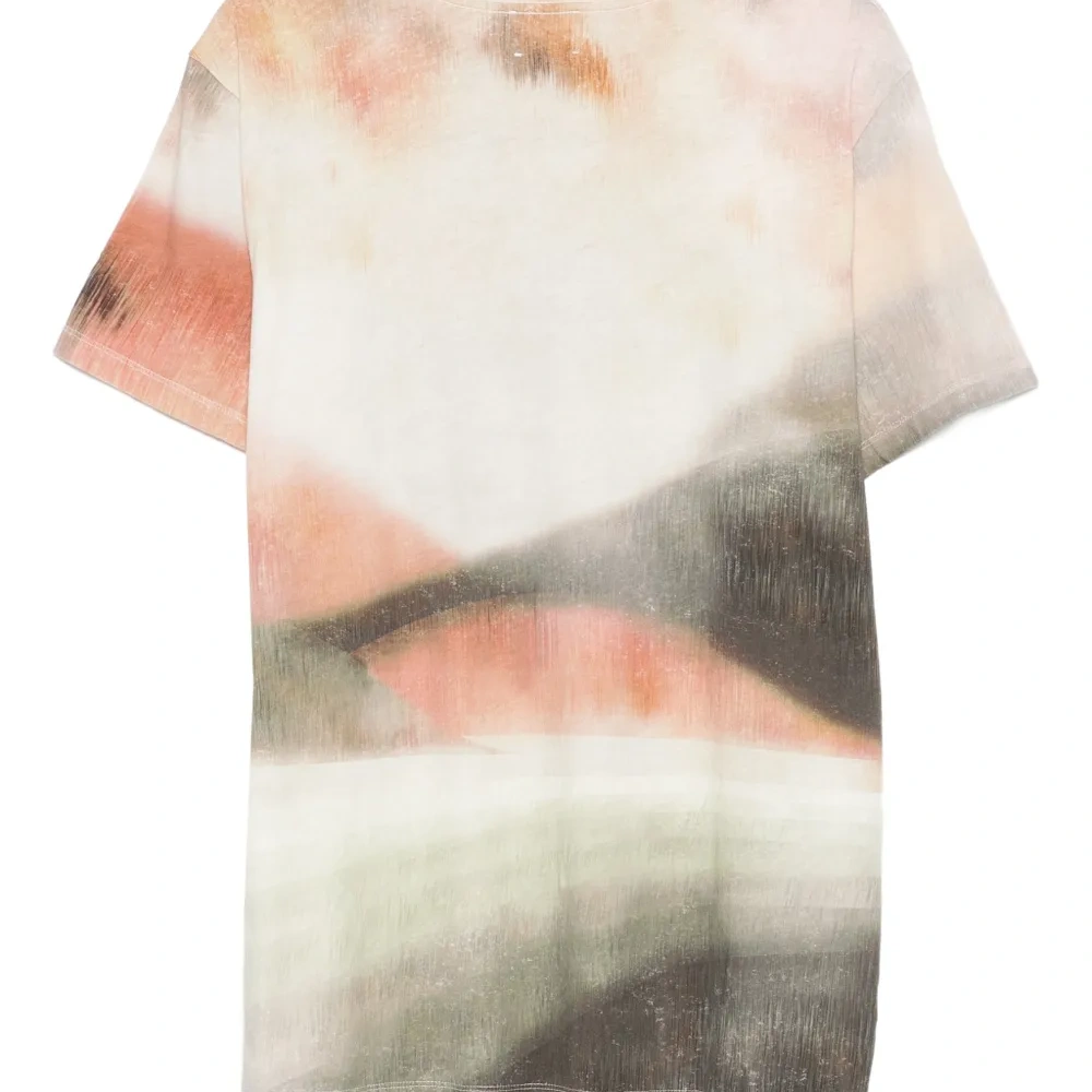 бежевая футболка с графическим принтом, круглым вырезом и короткими рукавами