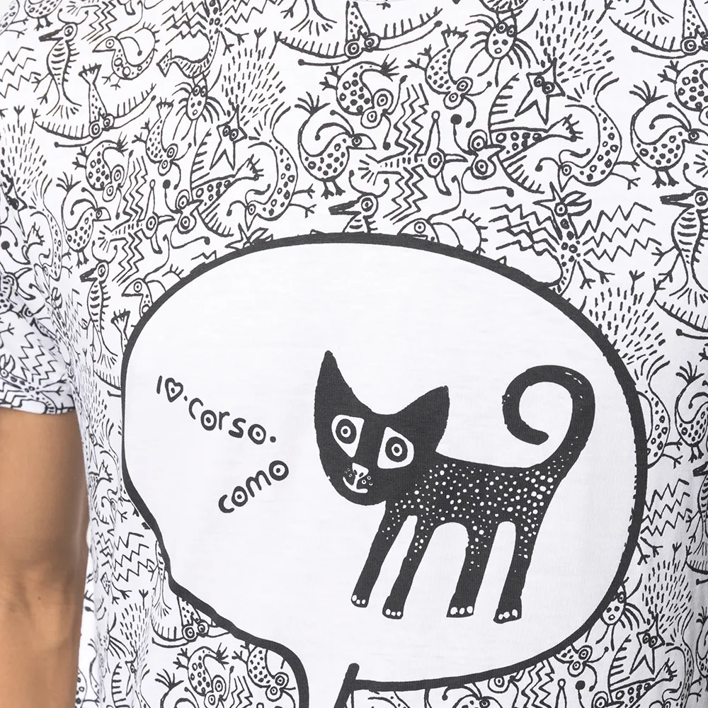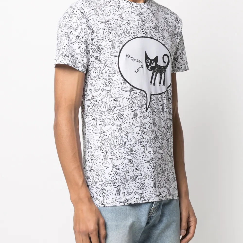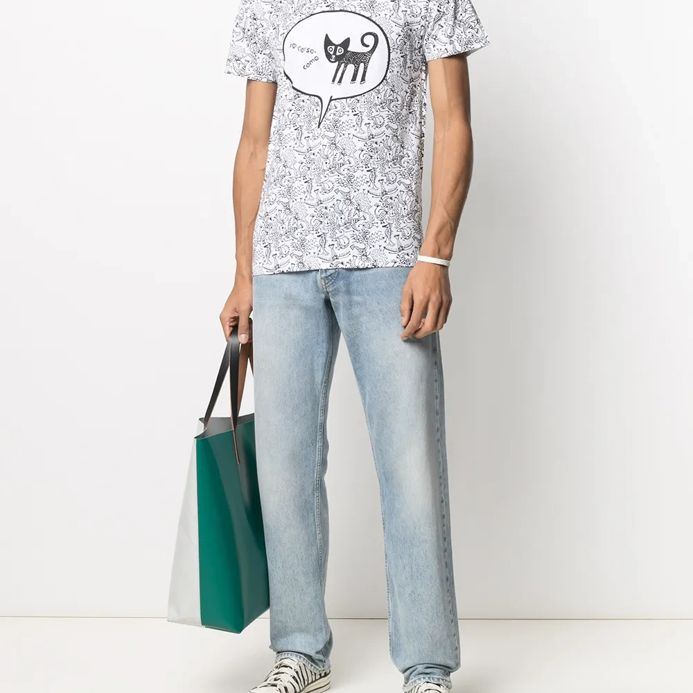 Сочетание двух оттенков, графичный принт, круглый вырез, короткие рукава и прямой подол.