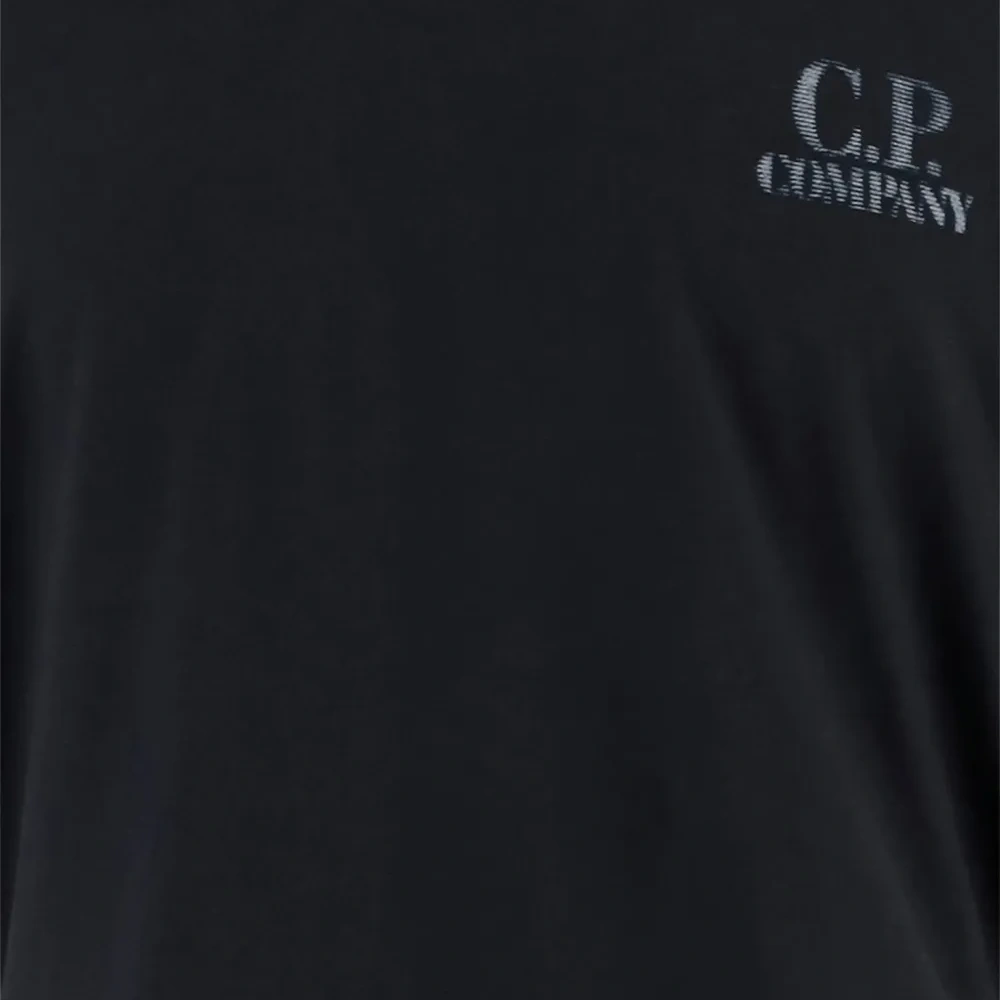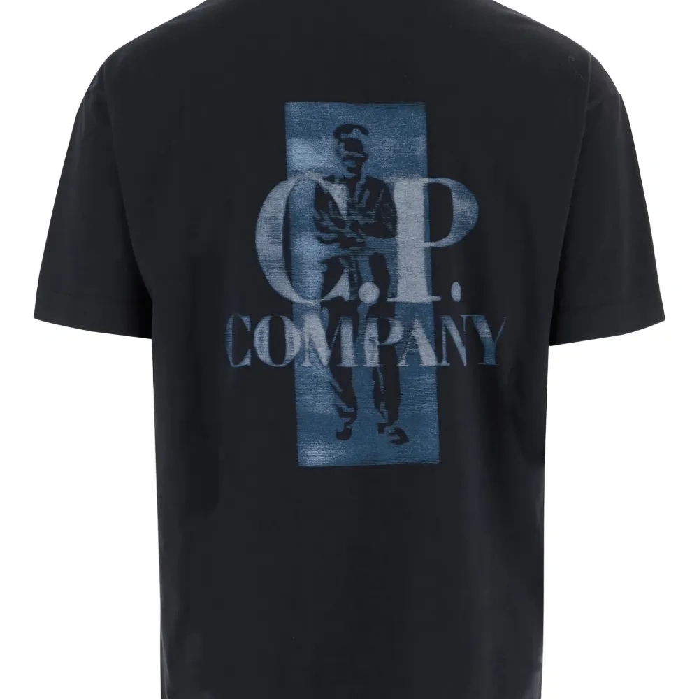 черная футболка с короткими рукавами, изображением на спине, логотипом и деталями, хлопок