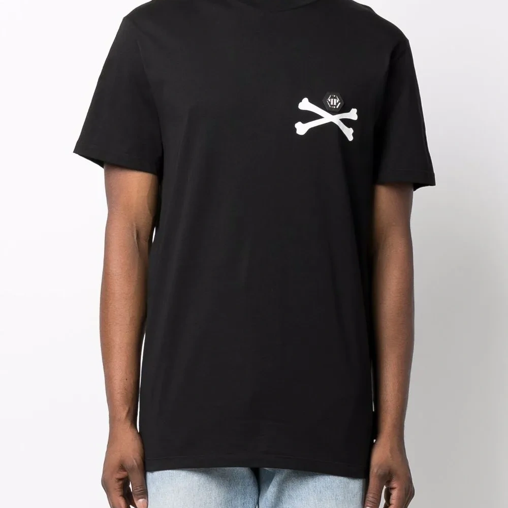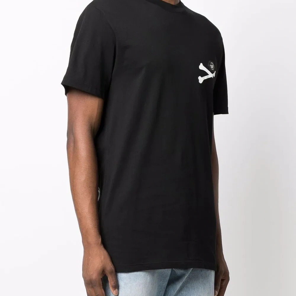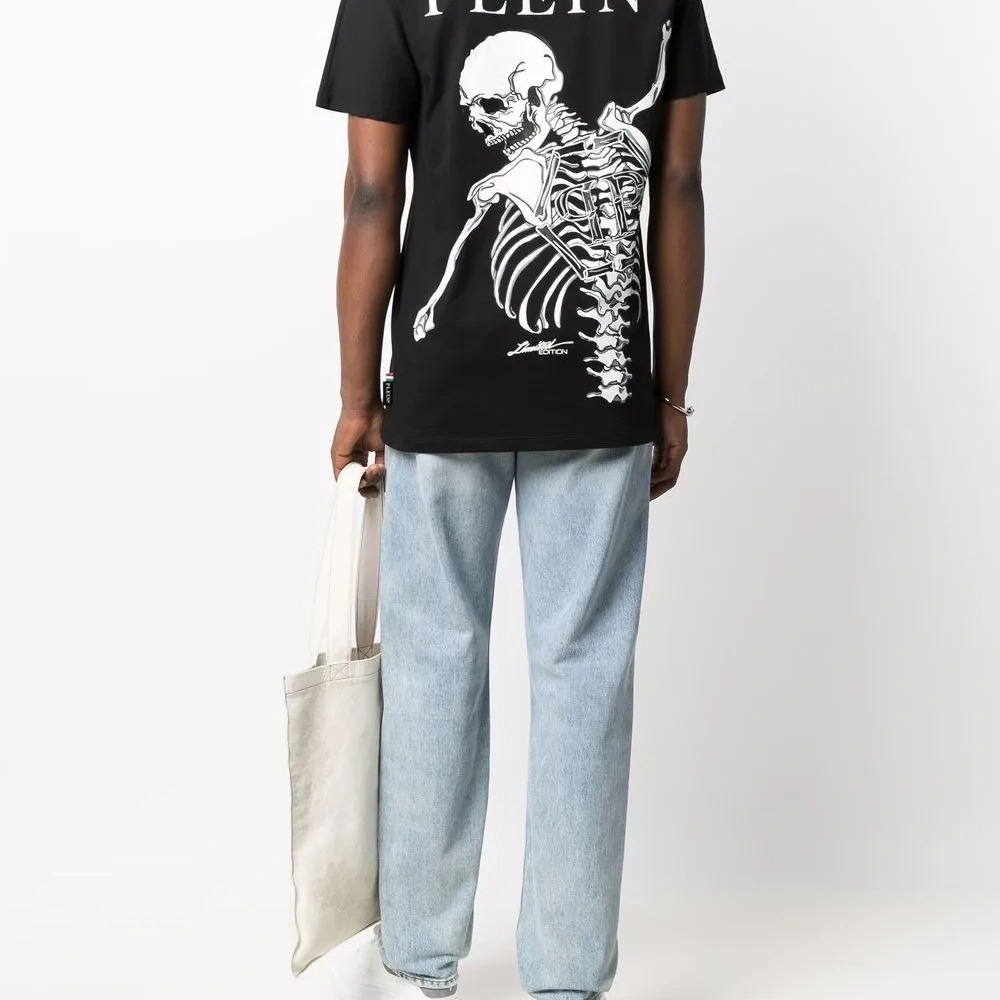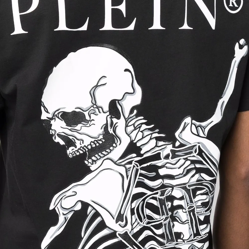 Принт с изображением скелета, принт с логотипом на груди, круглый вырез, короткие рукава и прямой подол. Цвет: черный.