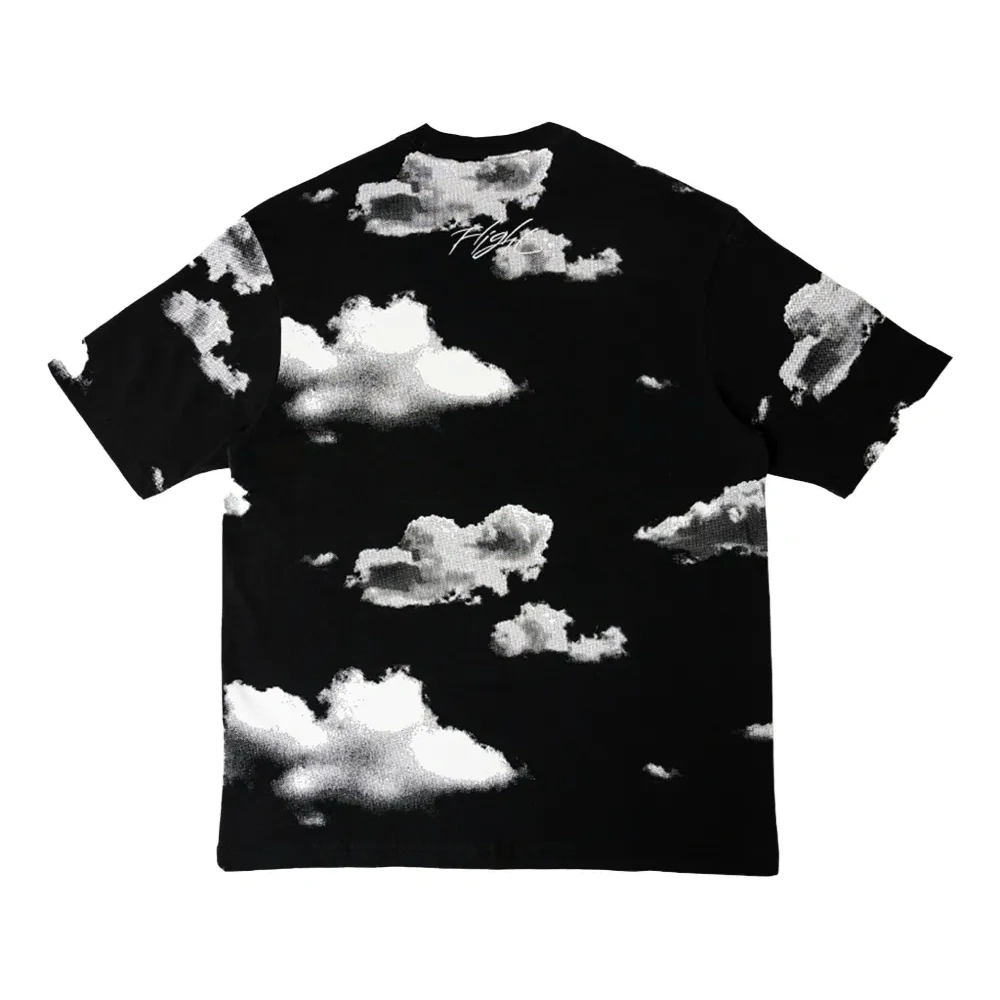 чёрная футболка с принтом облаков, круглый вырез, короткие рукава