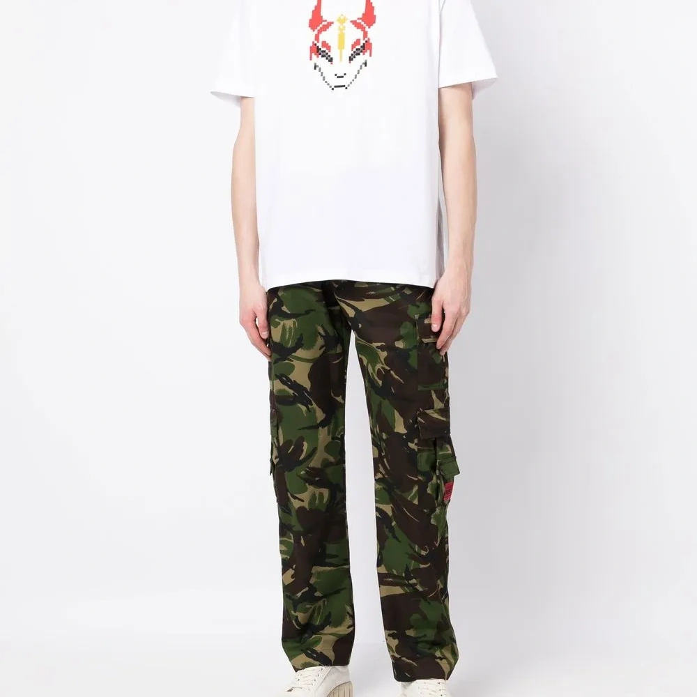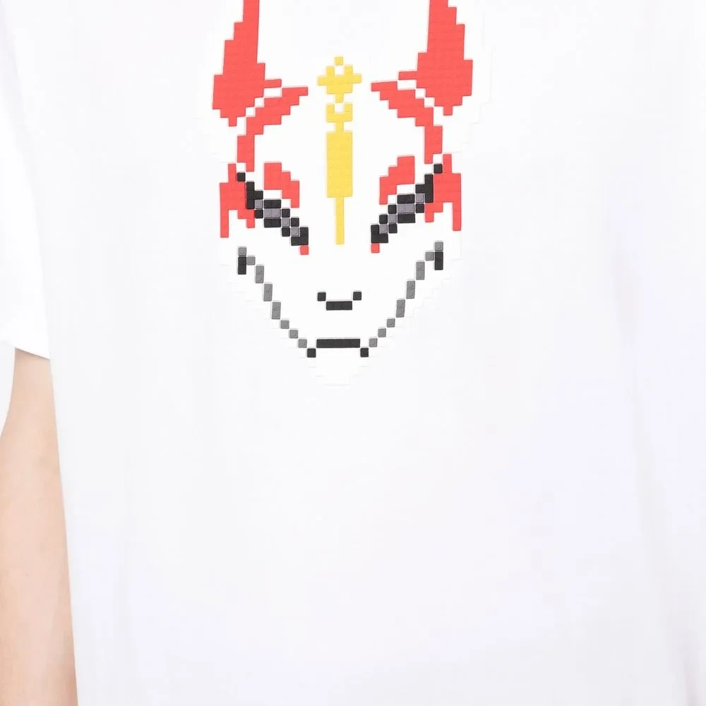 Белый, разноцветный, тисненая деталь, узор с изображением глаза, принт с надписью сзади, круглый вырез и короткие рукава.