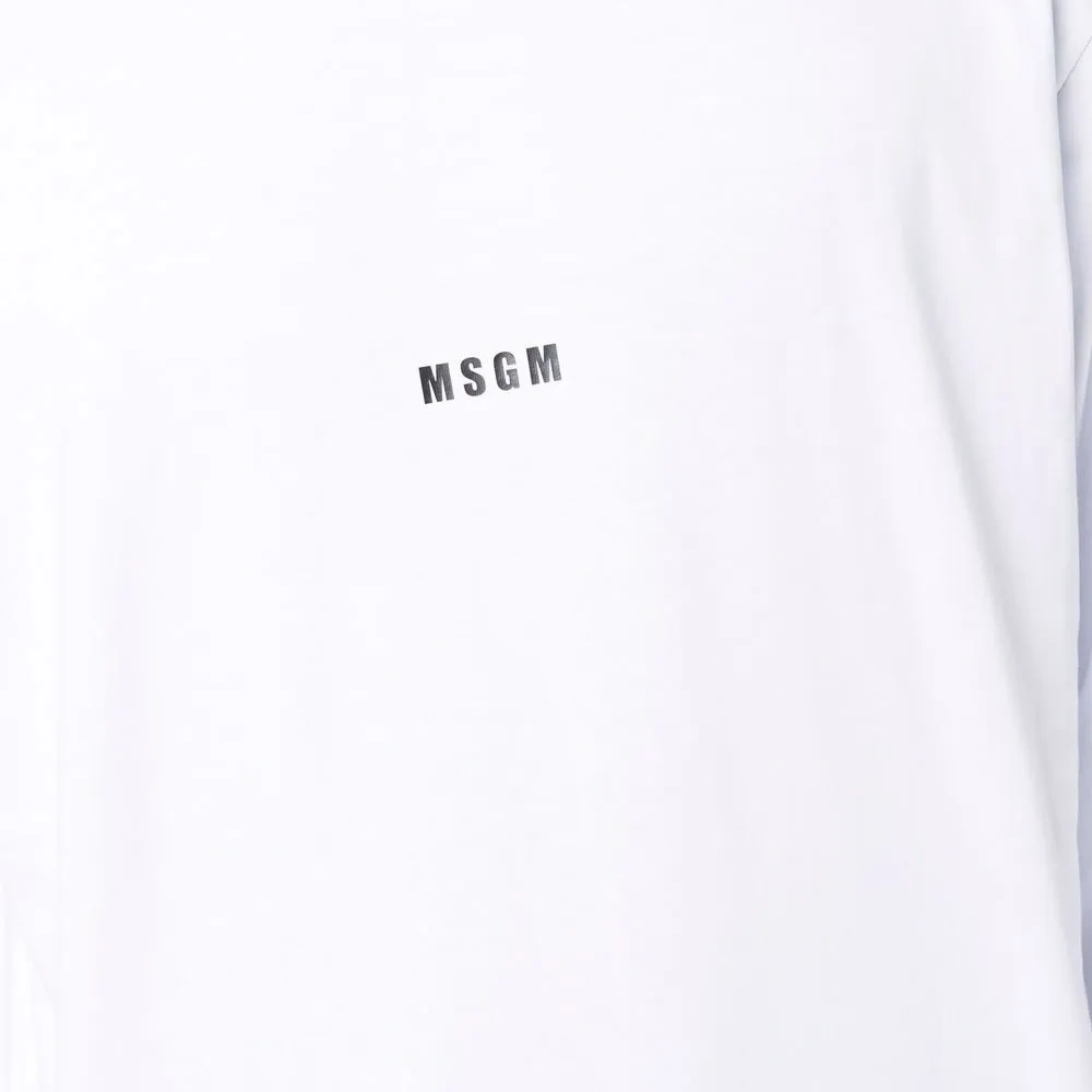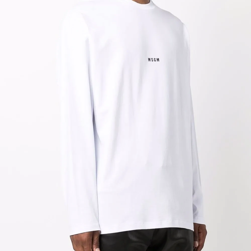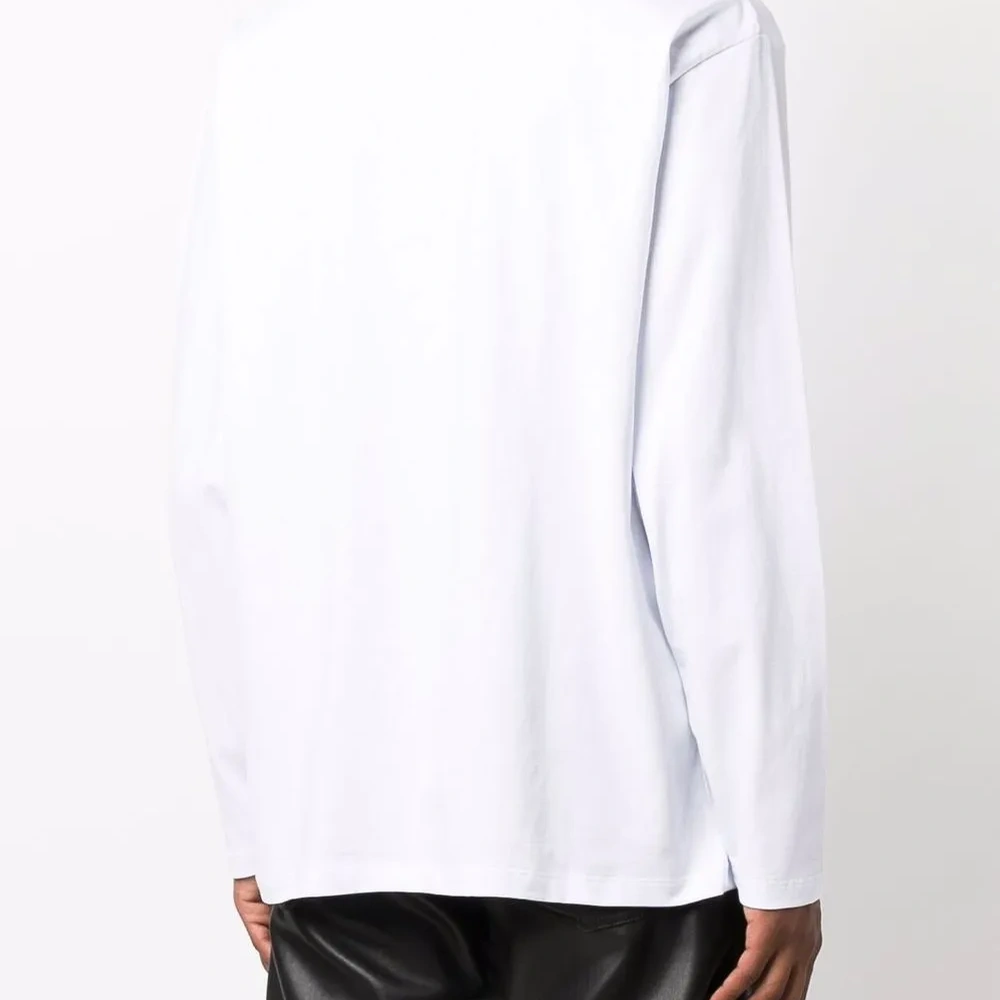 Принт с логотипом на груди, круглый вырез, длинные рукава и прямой подол.