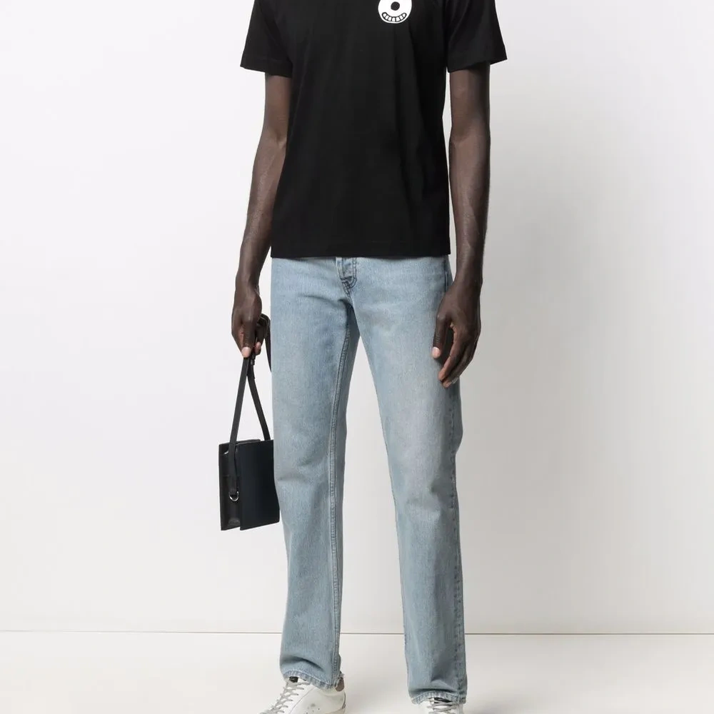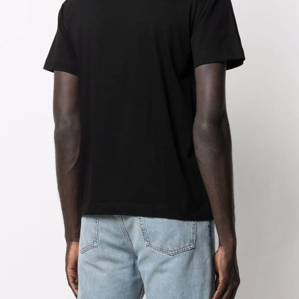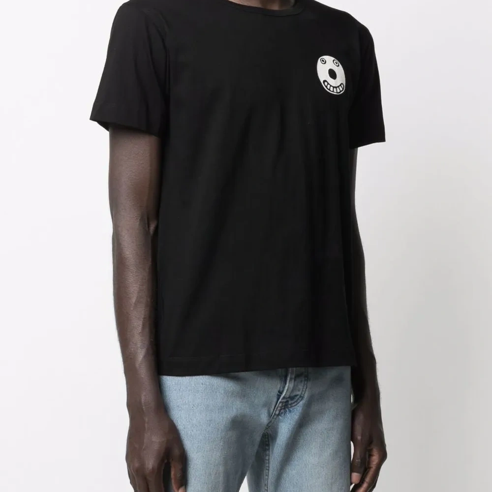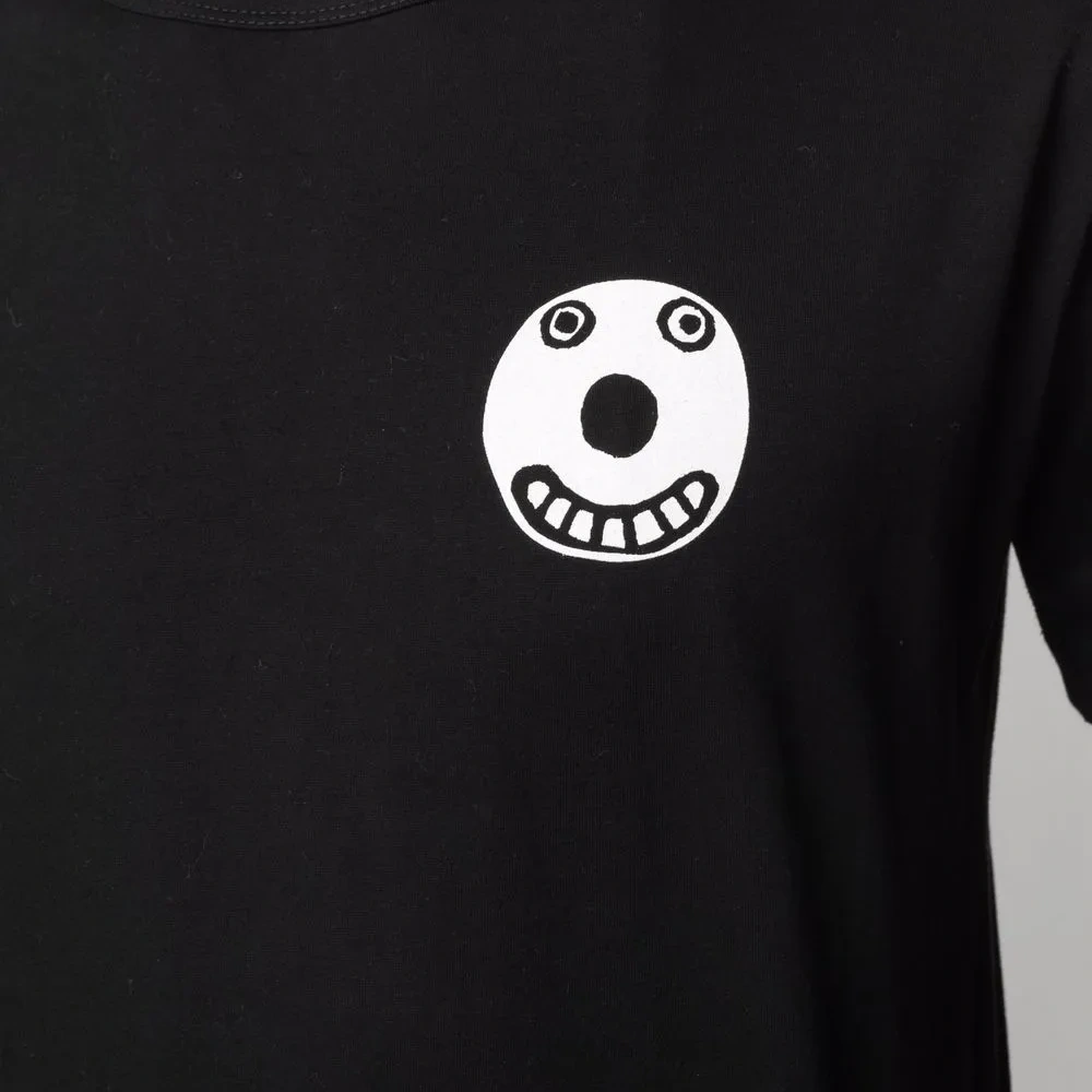 Принт на груди, круглый вырез, короткие рукава и прямой подол. Цвет: черный.
