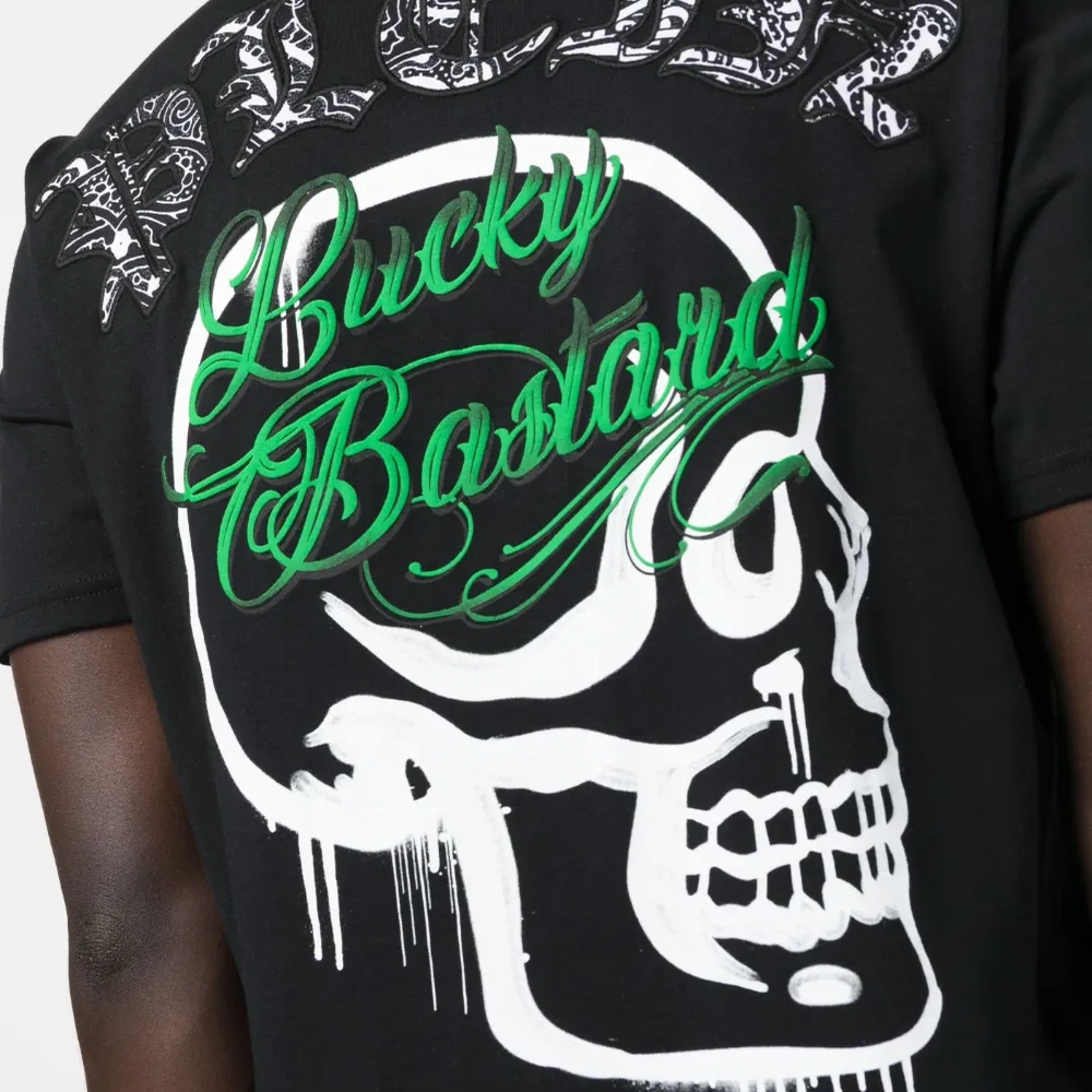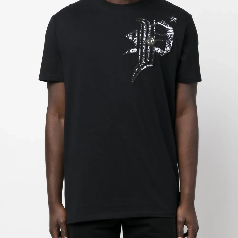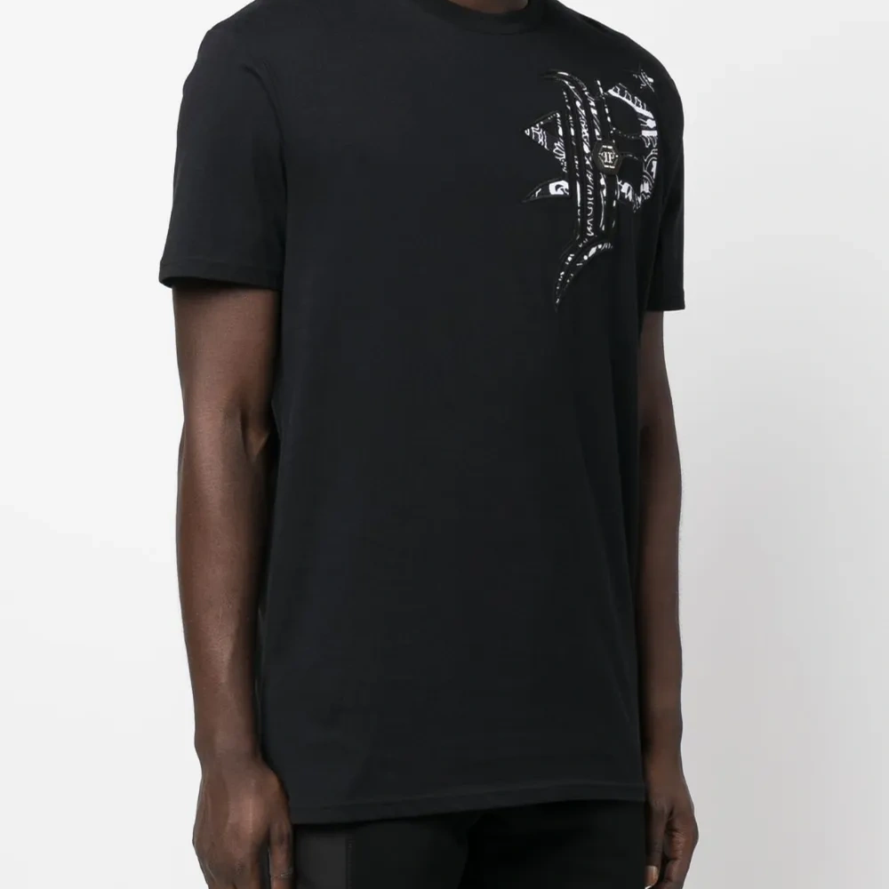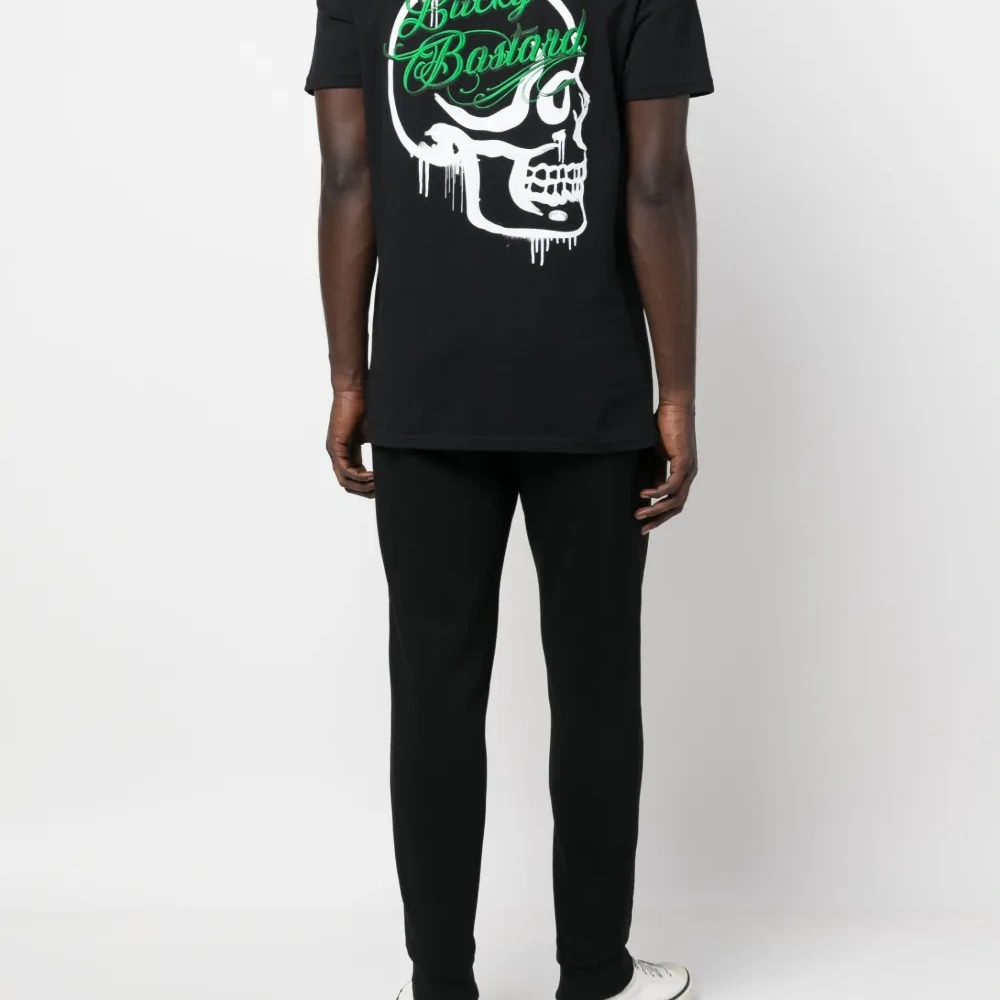 Черный/разноцветный, принт с логотипом на груди, графичный принт на спине, круглый вырез, короткие рукава и прямой подол.