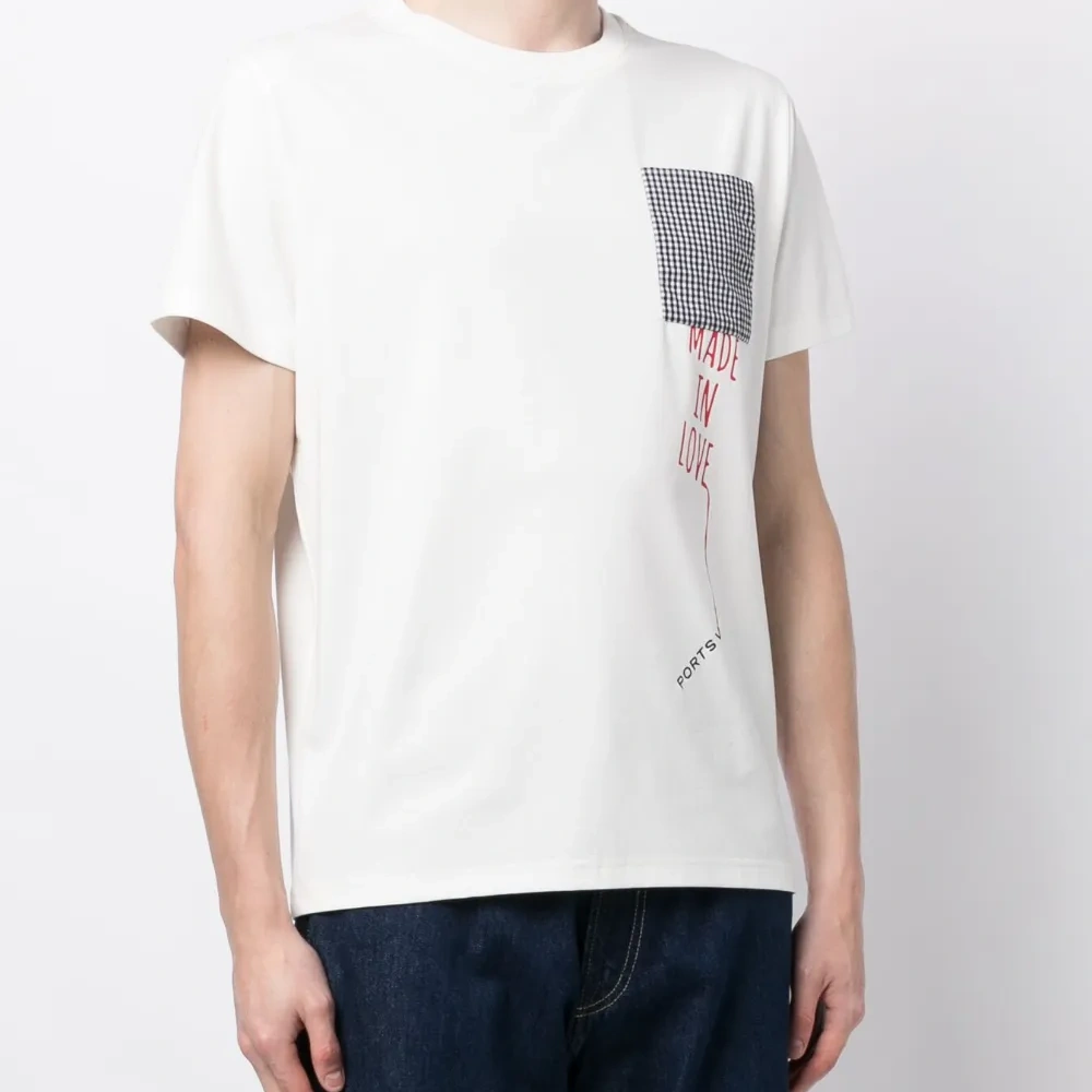 Белый/черный, смесовый хлопок, принт в клетку, принт с надписью спереди, вышитый логотип спереди, круглый вырез, короткие рукава и прямой подол.