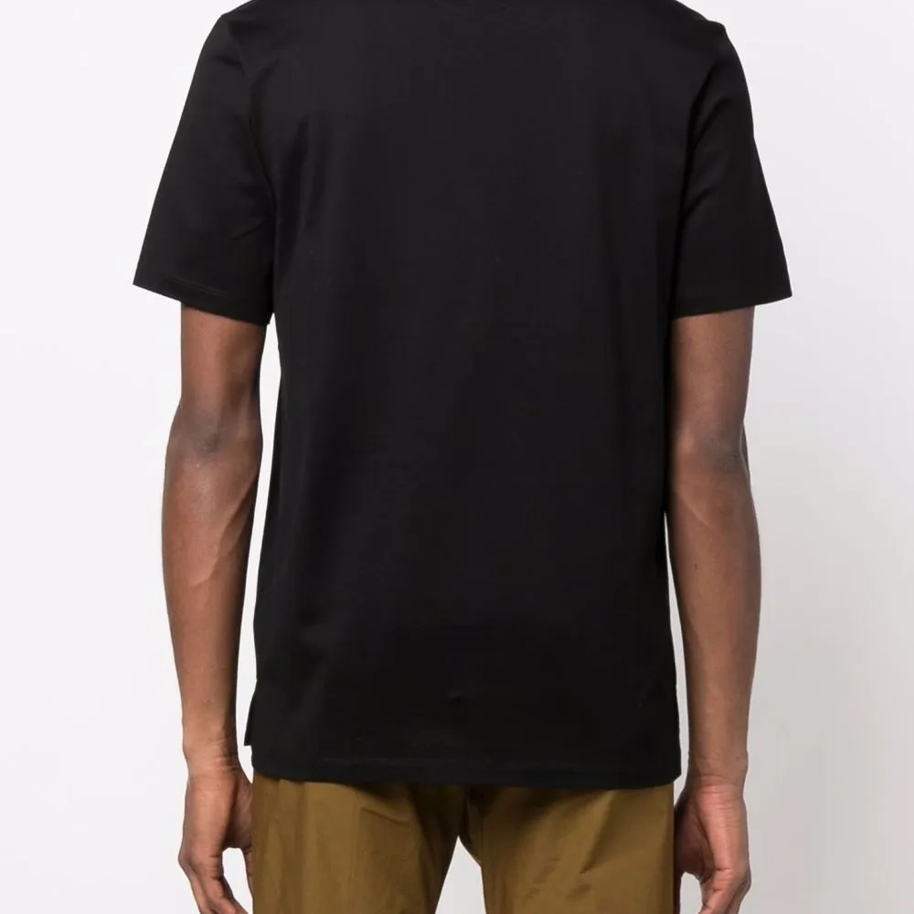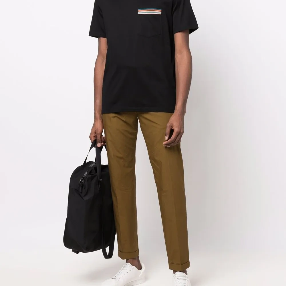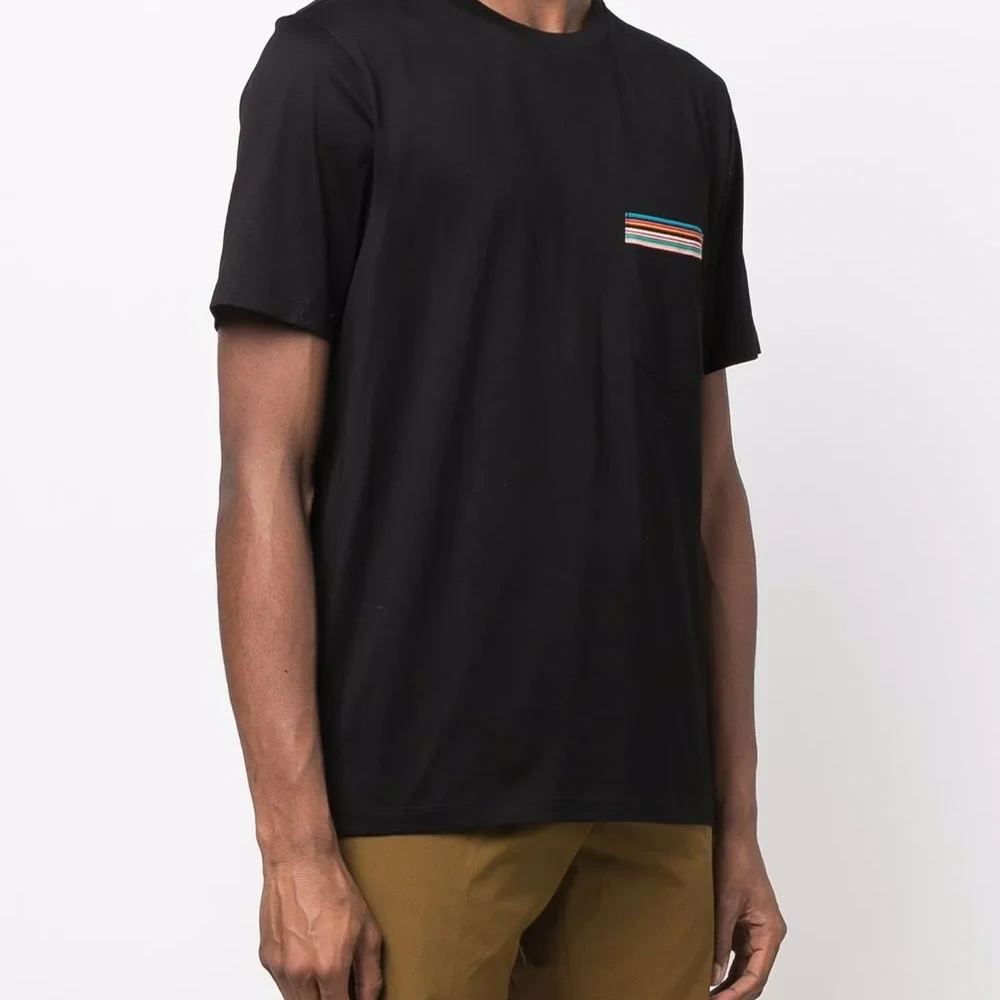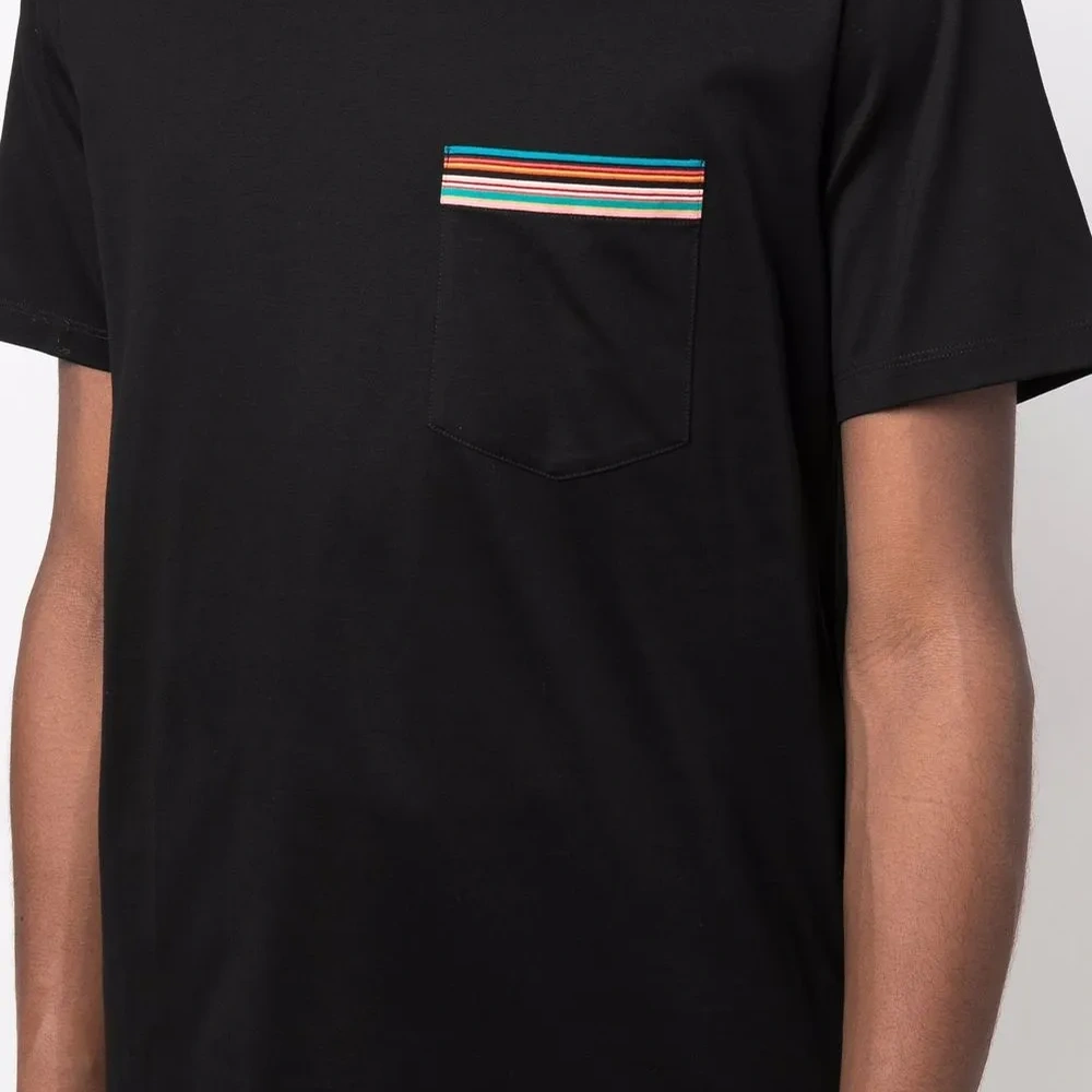 Ткань джерси, нагрудный накладной карман, вышитые края, узор Artist Stripe, круглый вырез, короткие рукава и прямой подол. Цвет: черный.