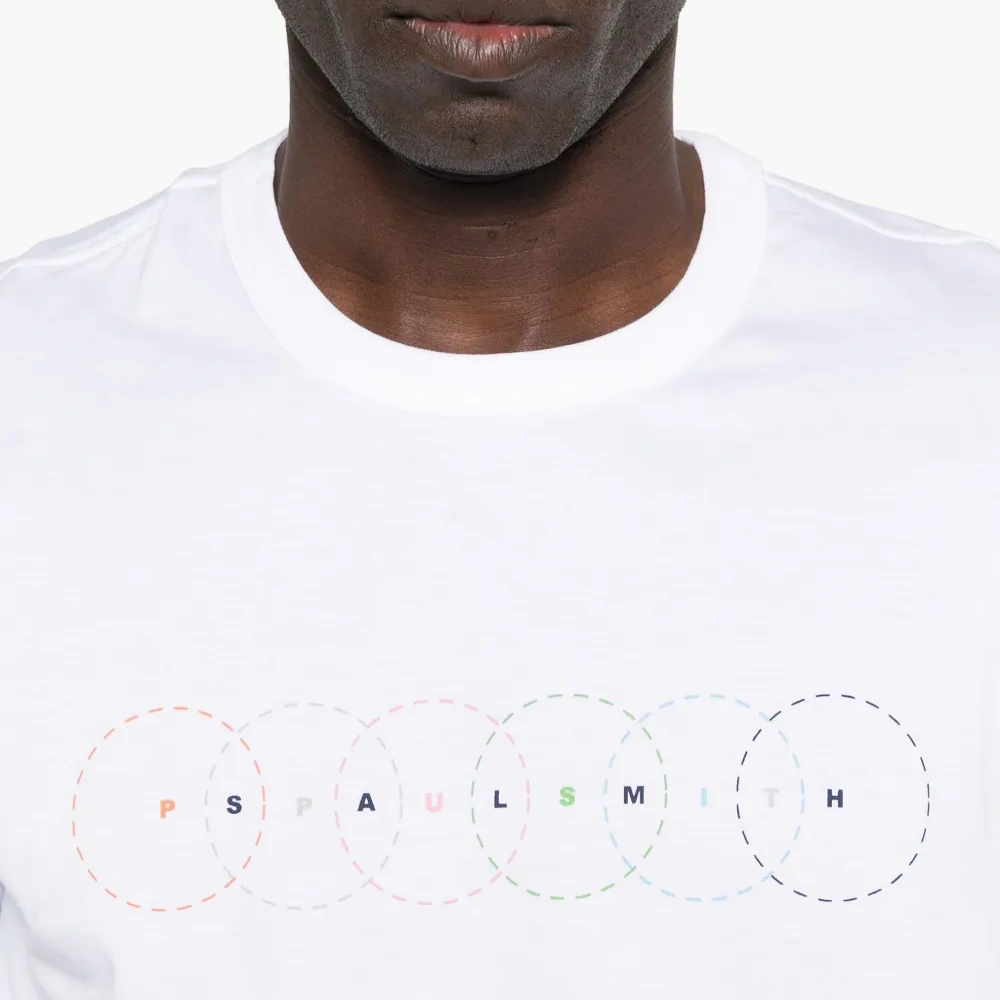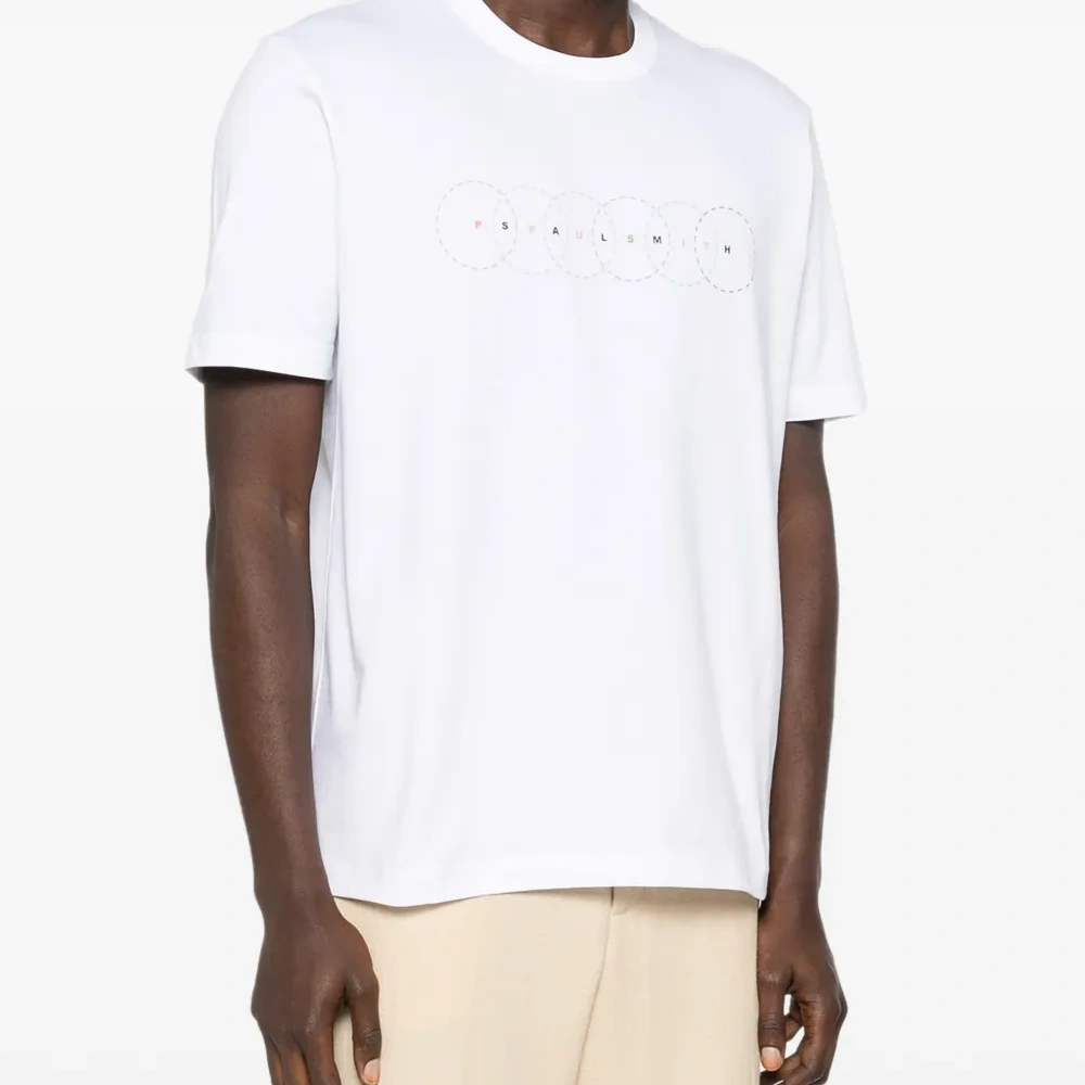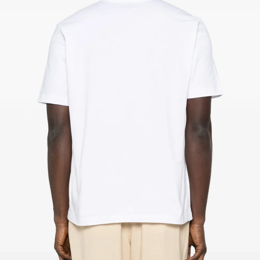 белая футболка с круглым вырезом, короткими рукавами и логотипом спереди