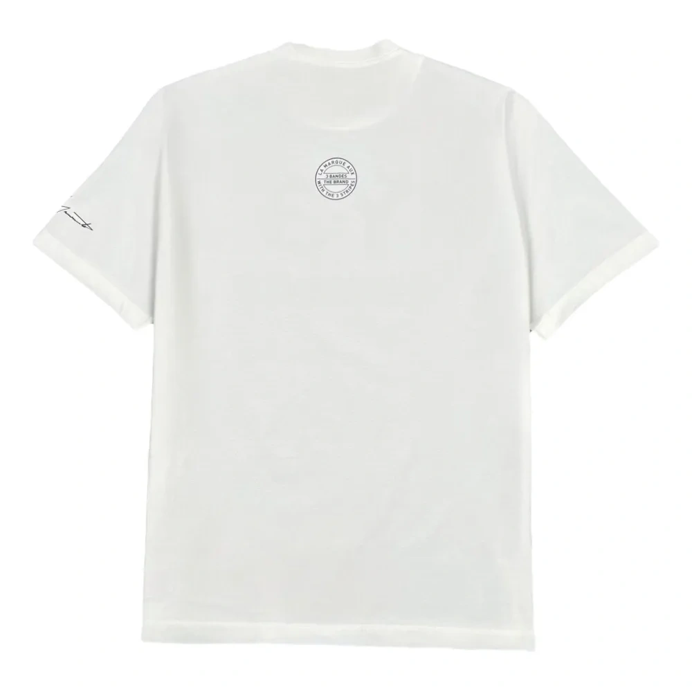 белая футболка с логотипом, круглым вырезом и короткими рукавами