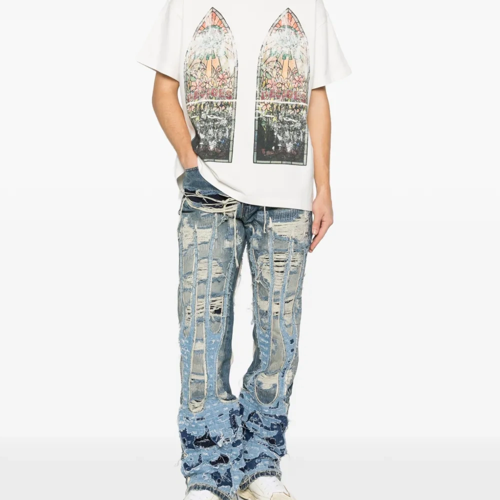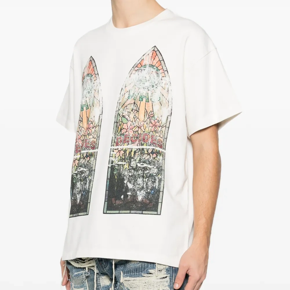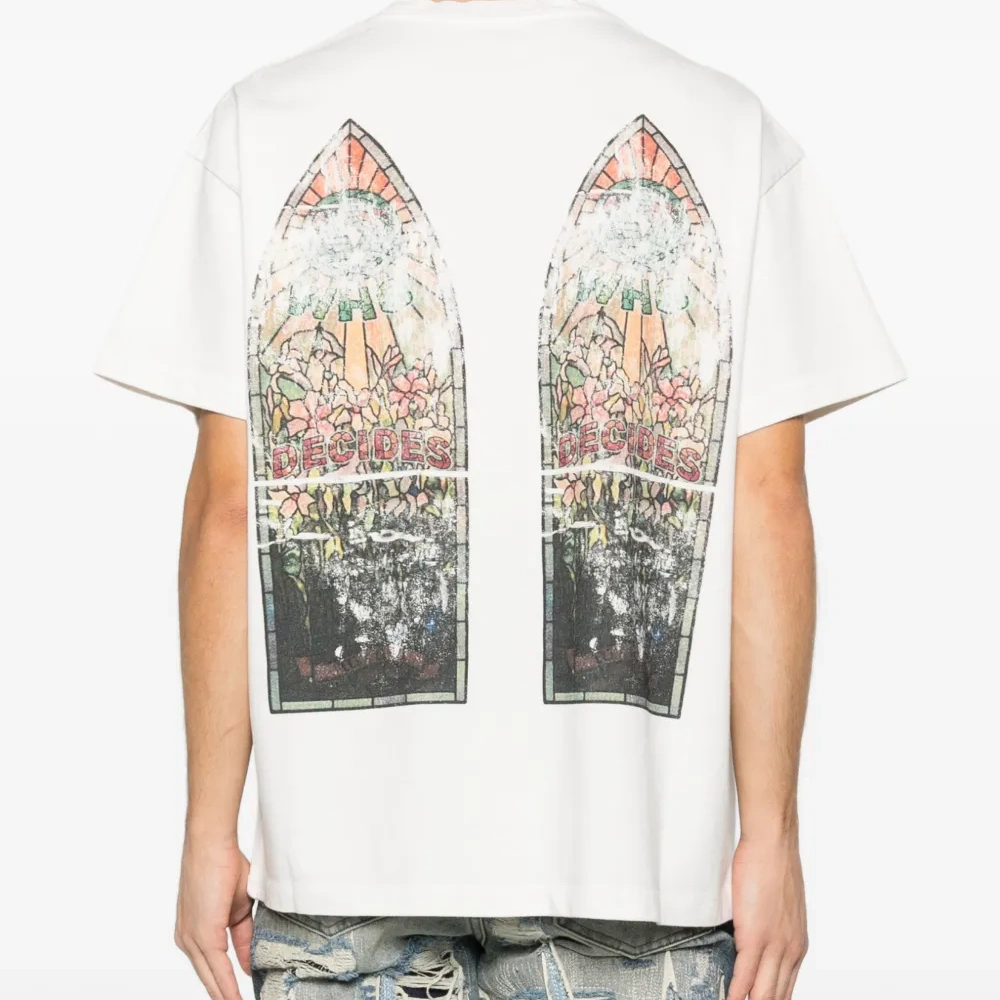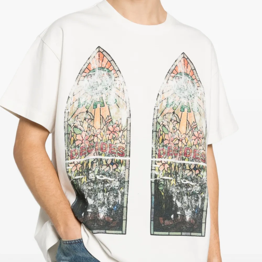 белая футболка с графическим принтом, круглым вырезом и короткими рукавами