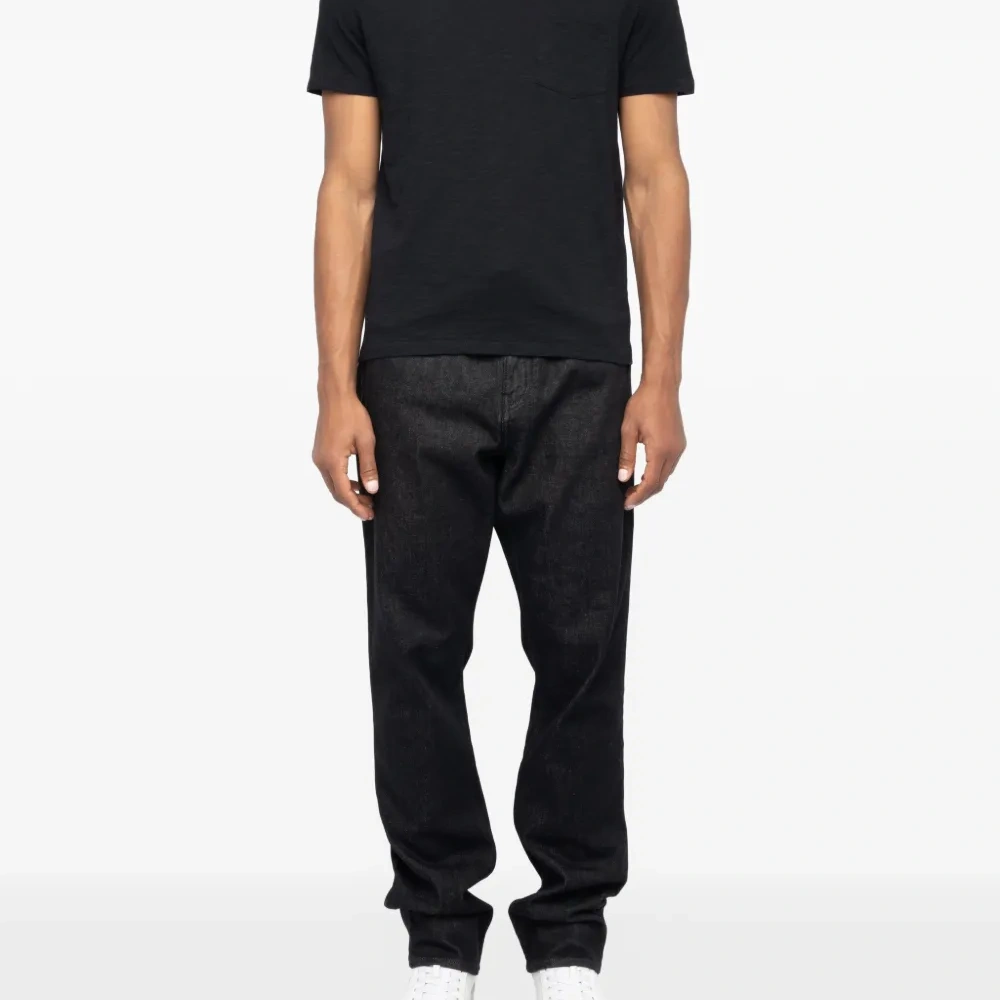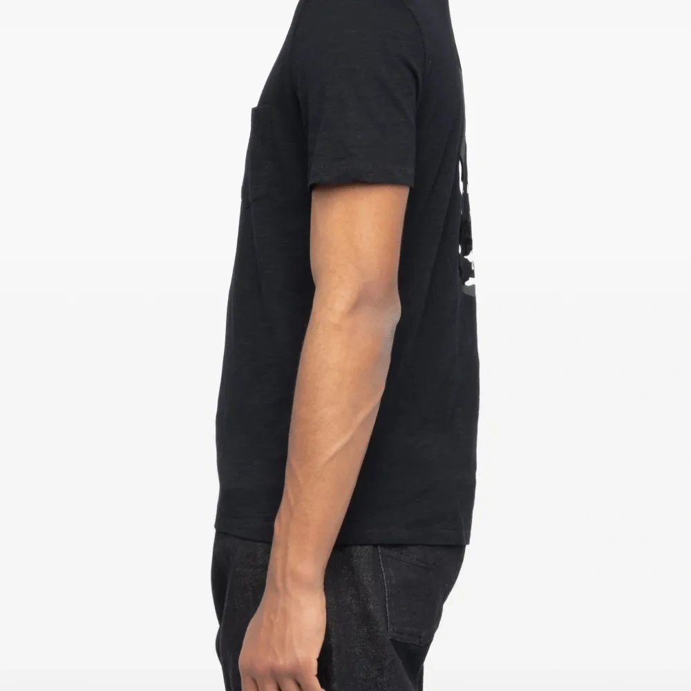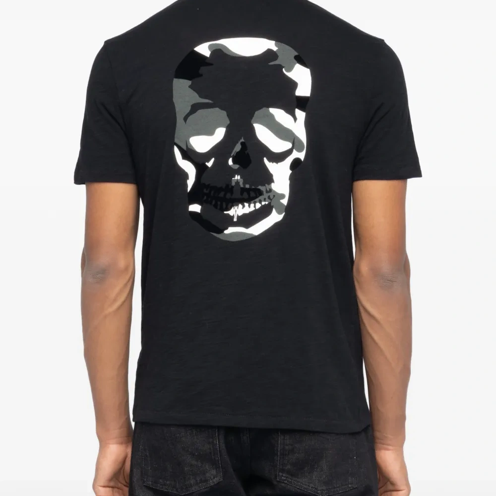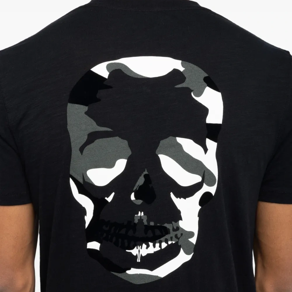 чёрная футболка с принтом черепа, нагрудным карманом, круглым вырезом и короткими рукавами