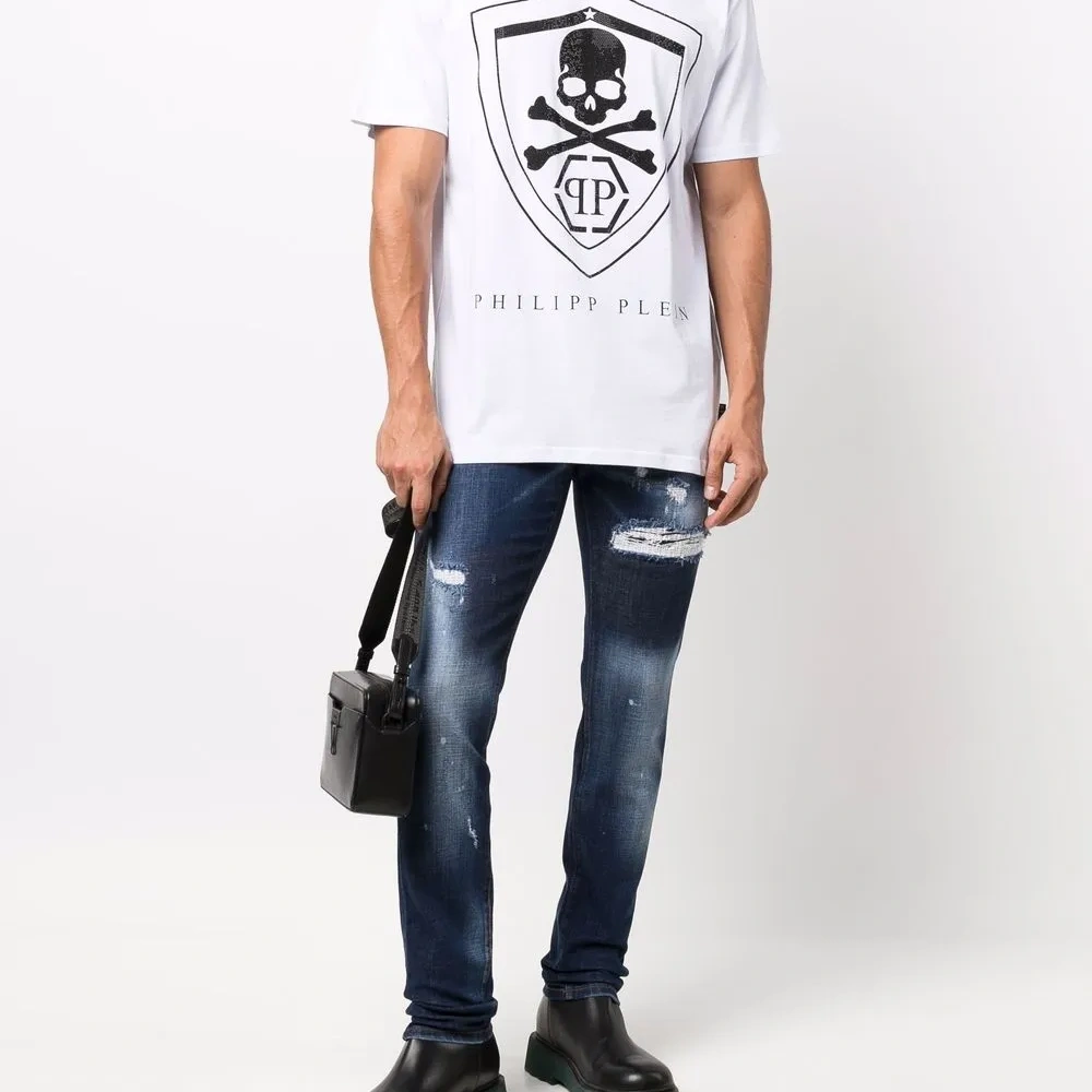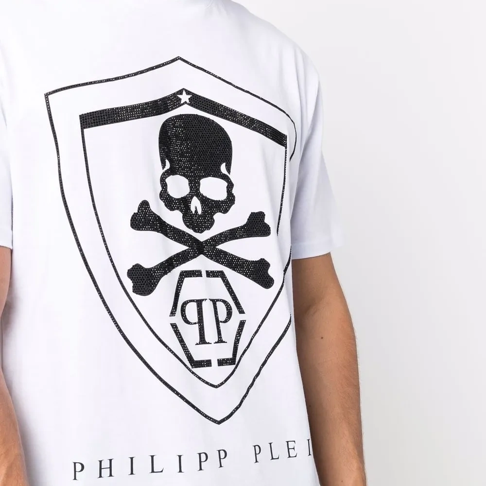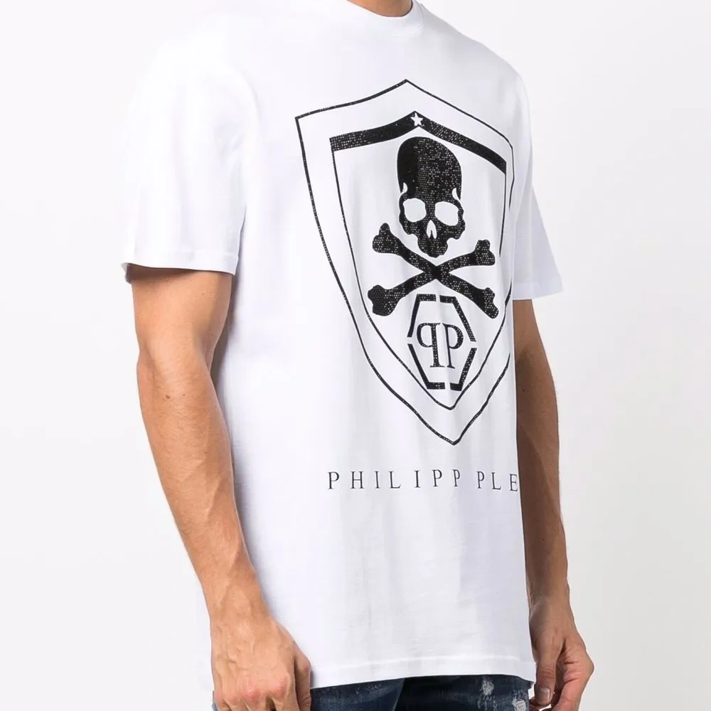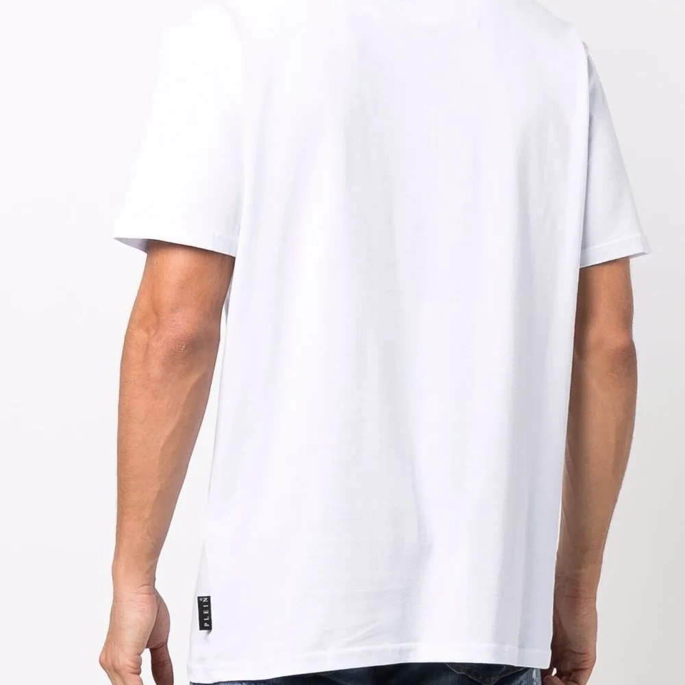 Украшения из горного хрусталя, логотип спереди, нашивка с логотипом сзади, круглый вырез, короткие рукава и прямой подол. Цвет: белый.