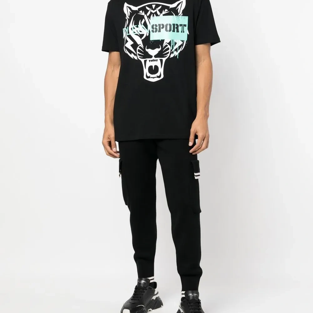 Принт с изображением тигра, логотип спереди, круглый вырез, короткие рукава и прямой подол.