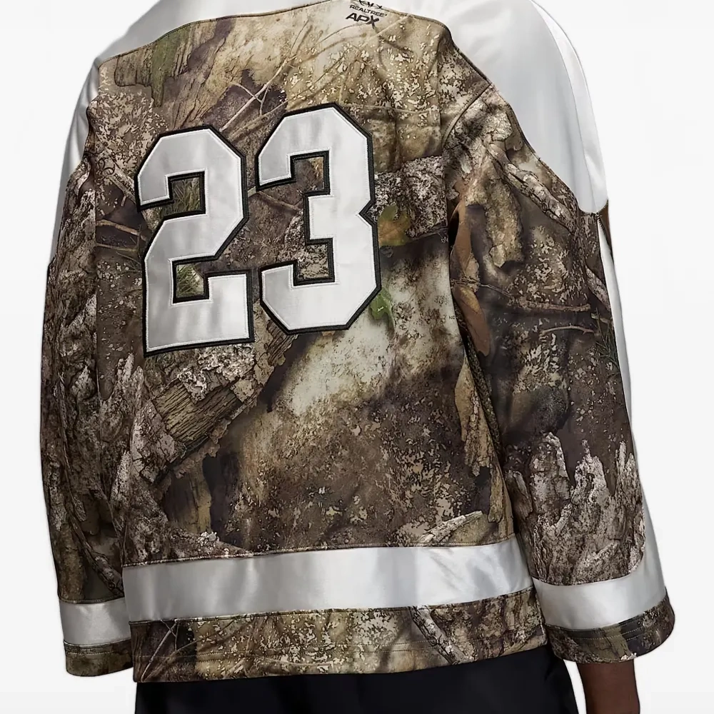 оливковый камуфляжный узор, пронумерованный дизайн, V-образный вырез, длинные рукава, полосатая отделка