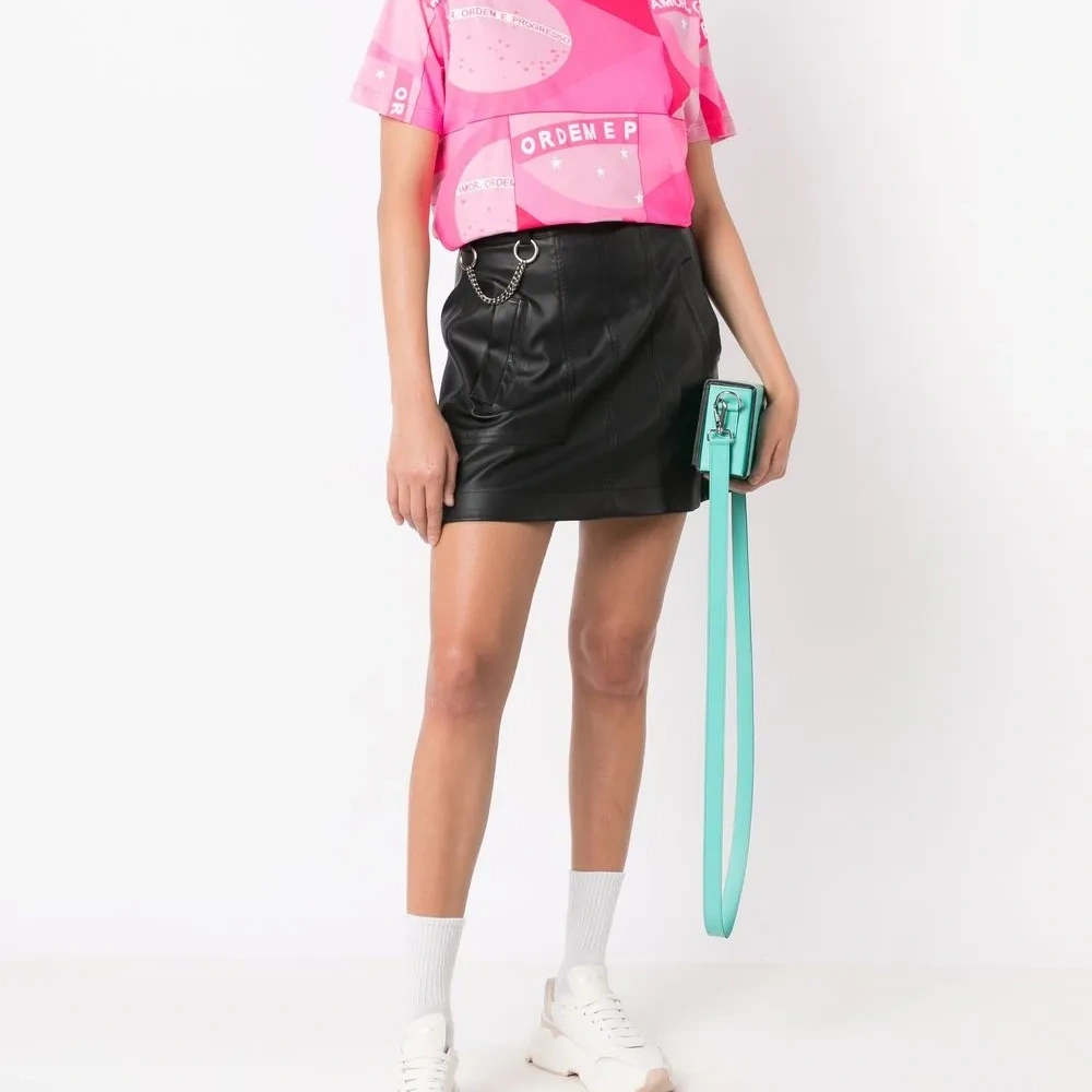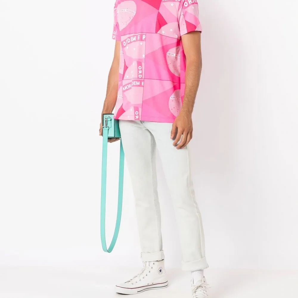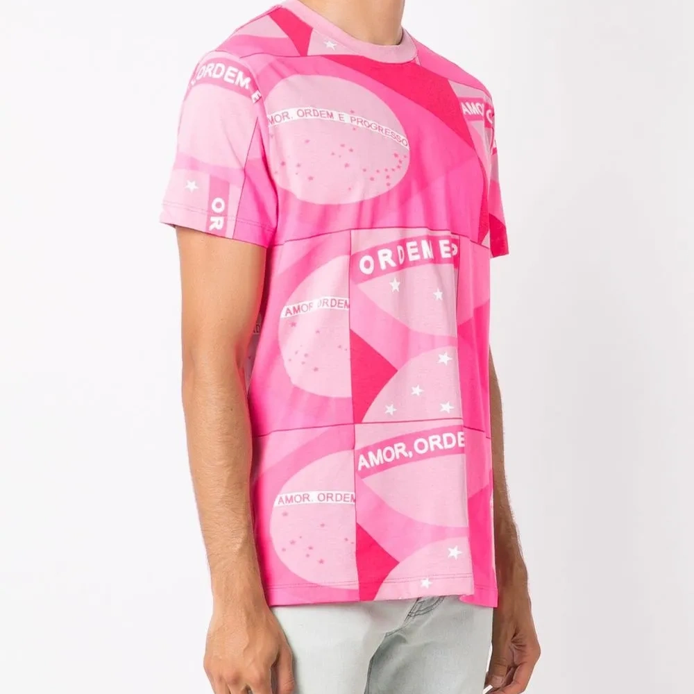 Ярко-розовый, хлопок, ткань джерси, сплошной графичный принт, круглый вырез, короткие рукава и прямой подол. Это унисекс-модель. Обратите внимание, что для нее используется мужская размерная сетка.