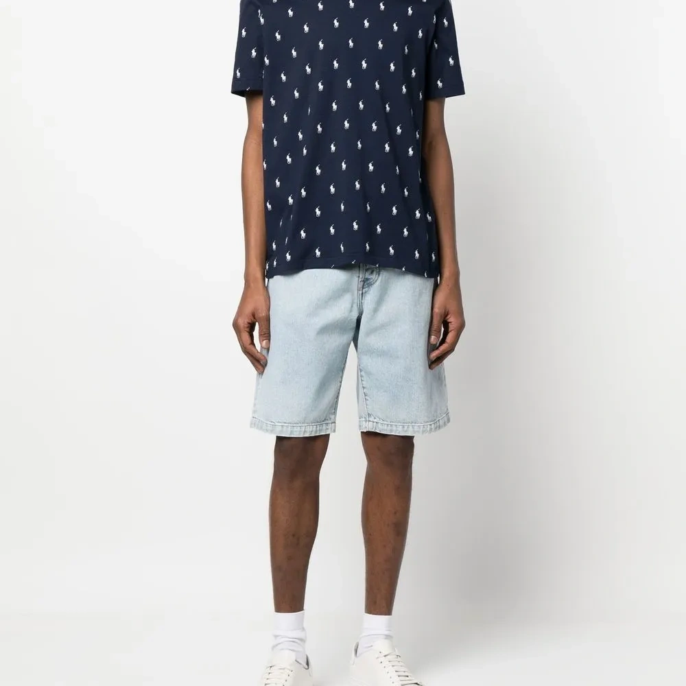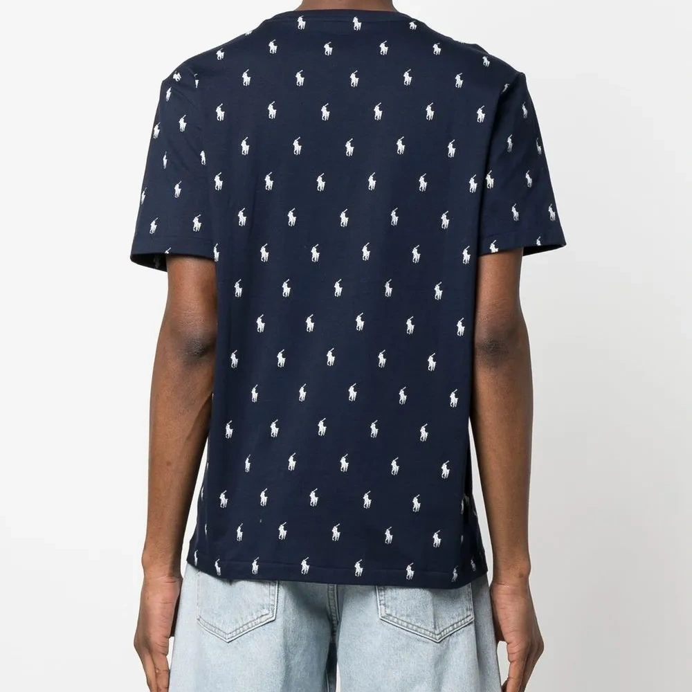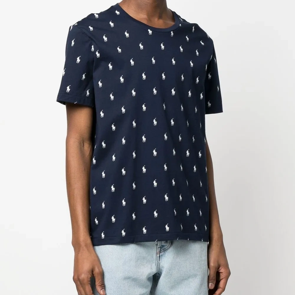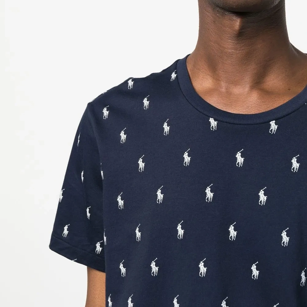 Темно-синий, сплошной принт с логотипом, прямой подол, круглый вырез и короткие рукава.