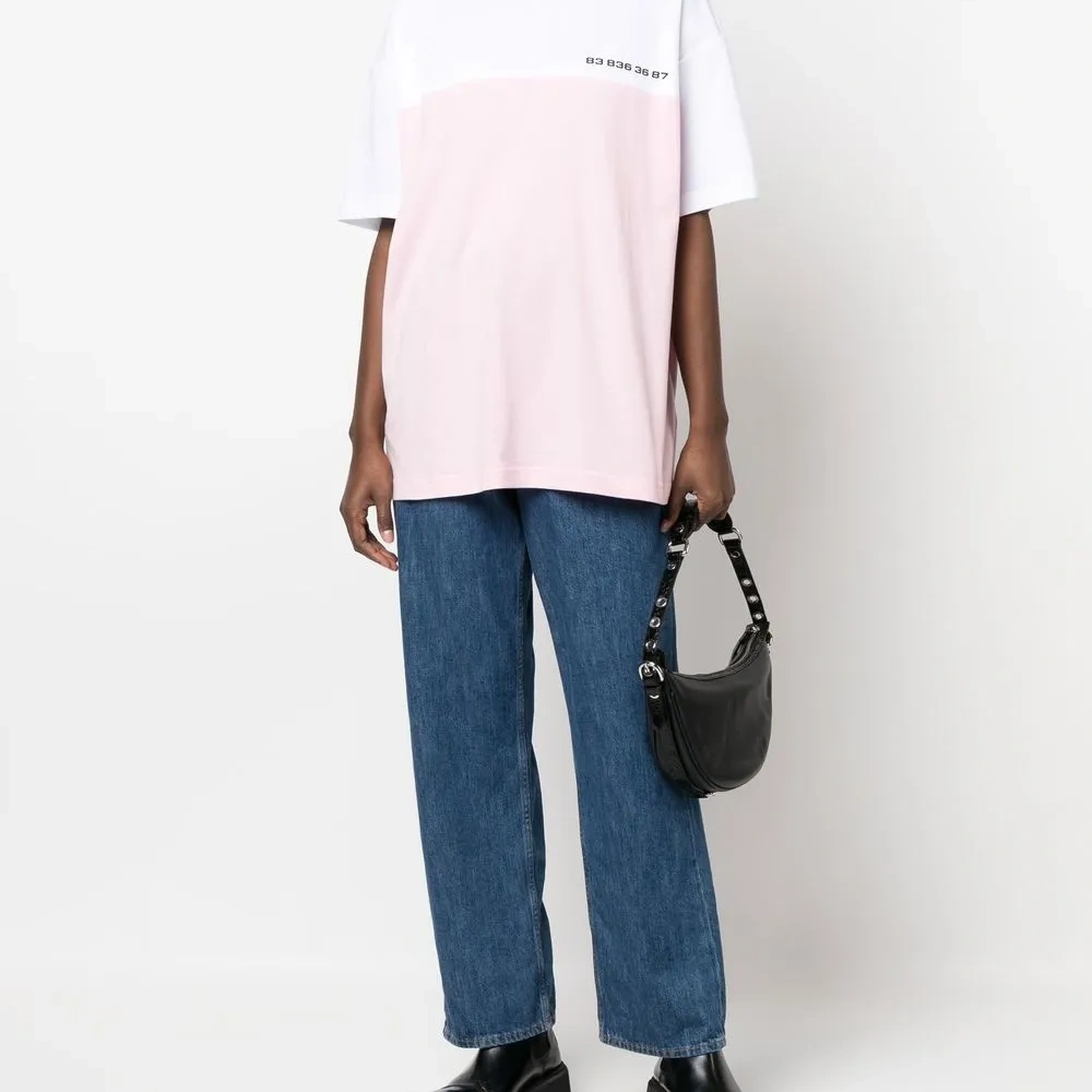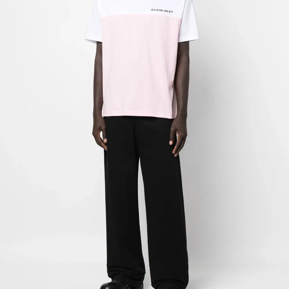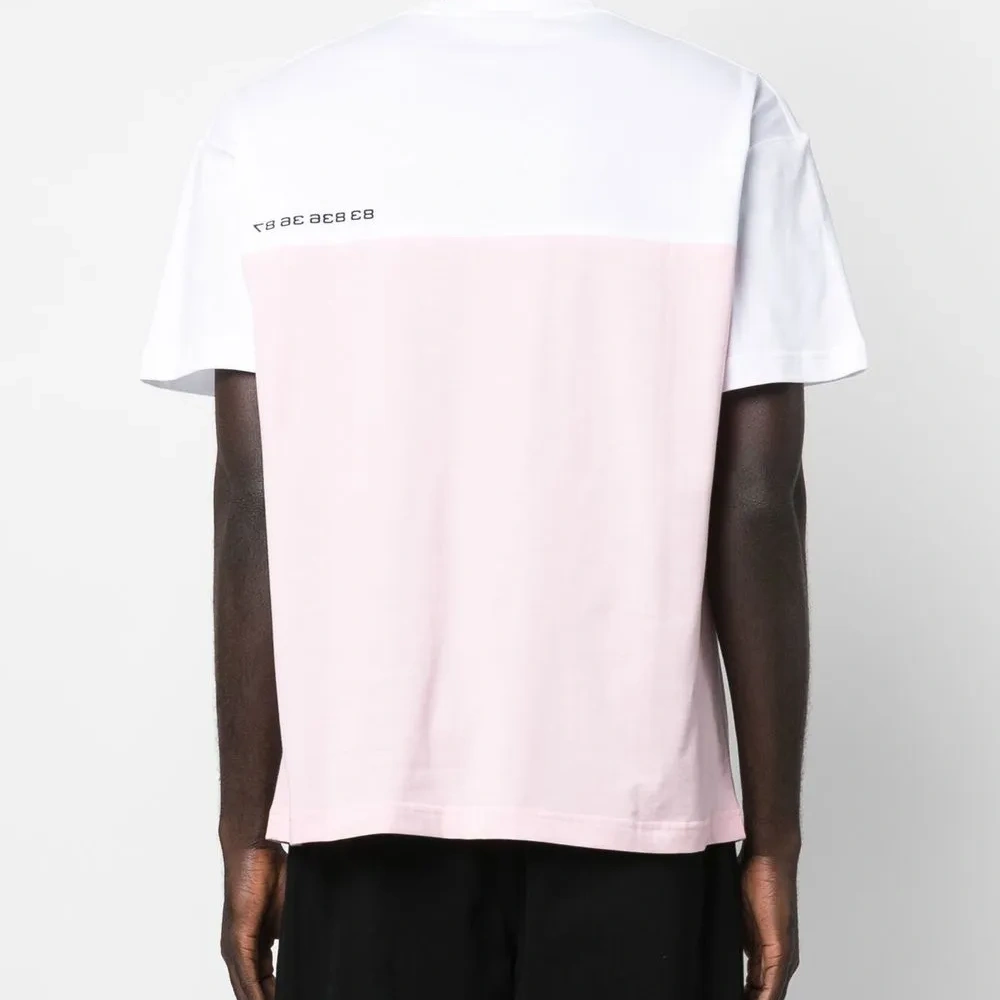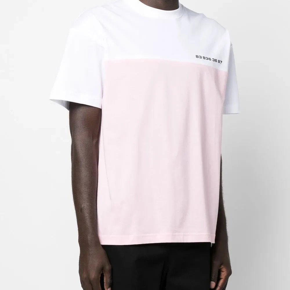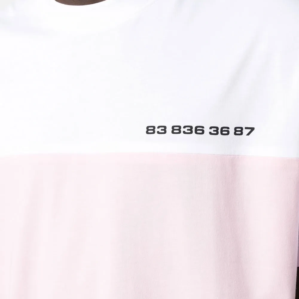 Белый, светло-розовый, дизайн колор-блок, принт с логотипом на груди, круглый вырез, короткие рукава и прямой подол. Это унисекс-модель. Обратите внимание, что для нее используется мужская размерная сетка.