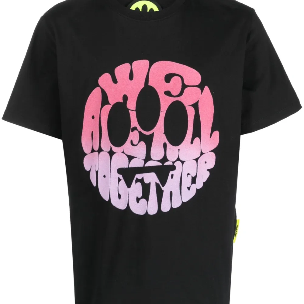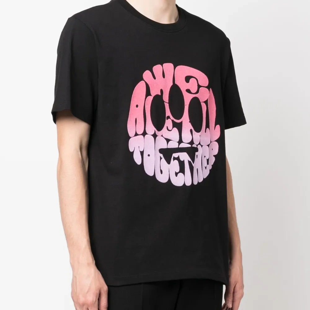 Черный, хлопок, графичный принт спереди, принт с логотипом сзади, круглый вырез, короткие рукава и прямой подол.