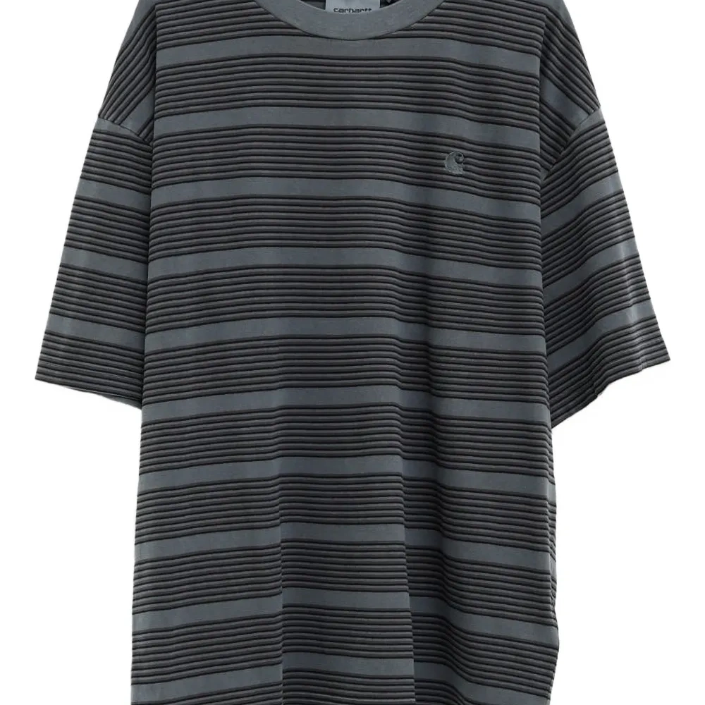 серый полосатый лого, круглый вырез, короткие рукава, свободный крой