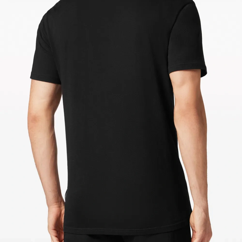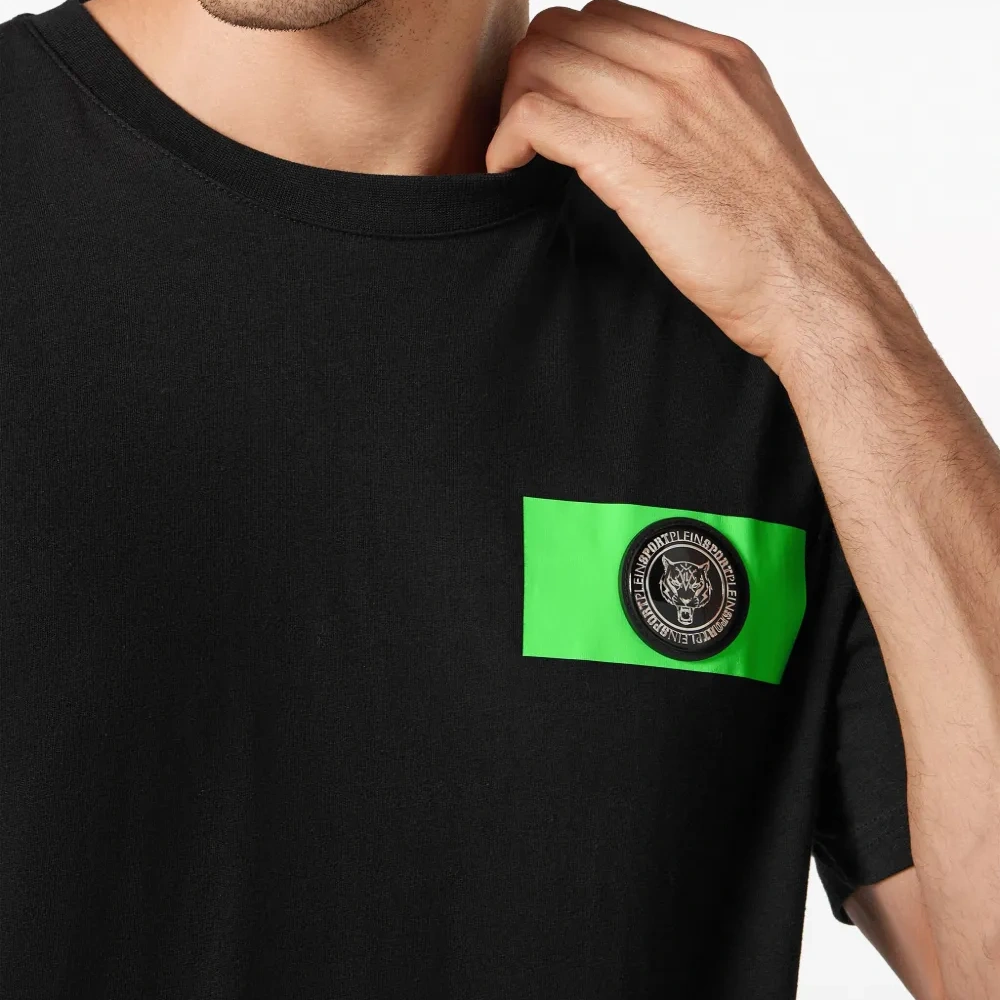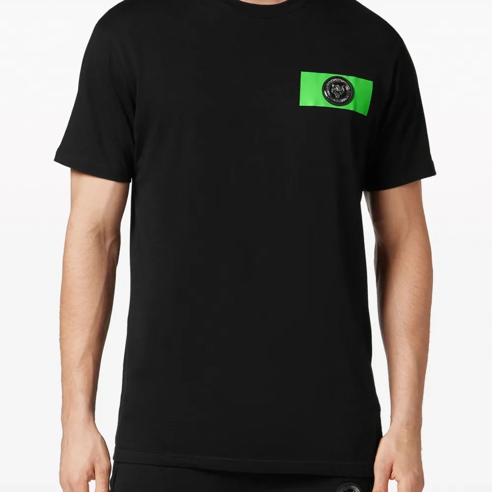 Черный, хлопок, нашивка с логотипом на груди, круглый вырез, короткие рукава и прямой подол.