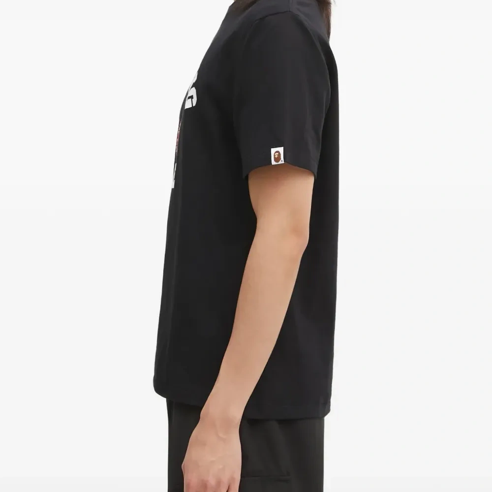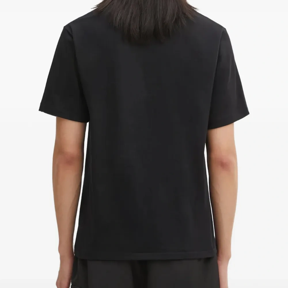 черная футболка с графическим принтом, деталями с логотипом, круглым вырезом, короткими рукавами и нашивкой с логотипом