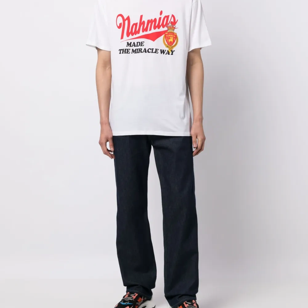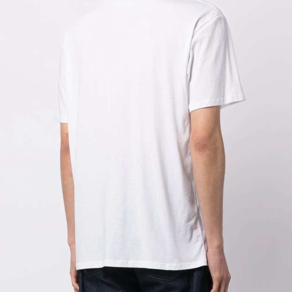 Белый, хлопок, логотип спереди, круглый вырез, короткие рукава и прямой подол.