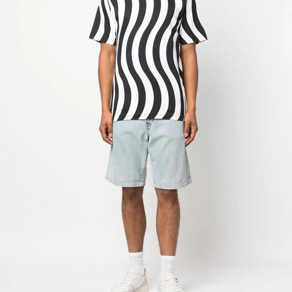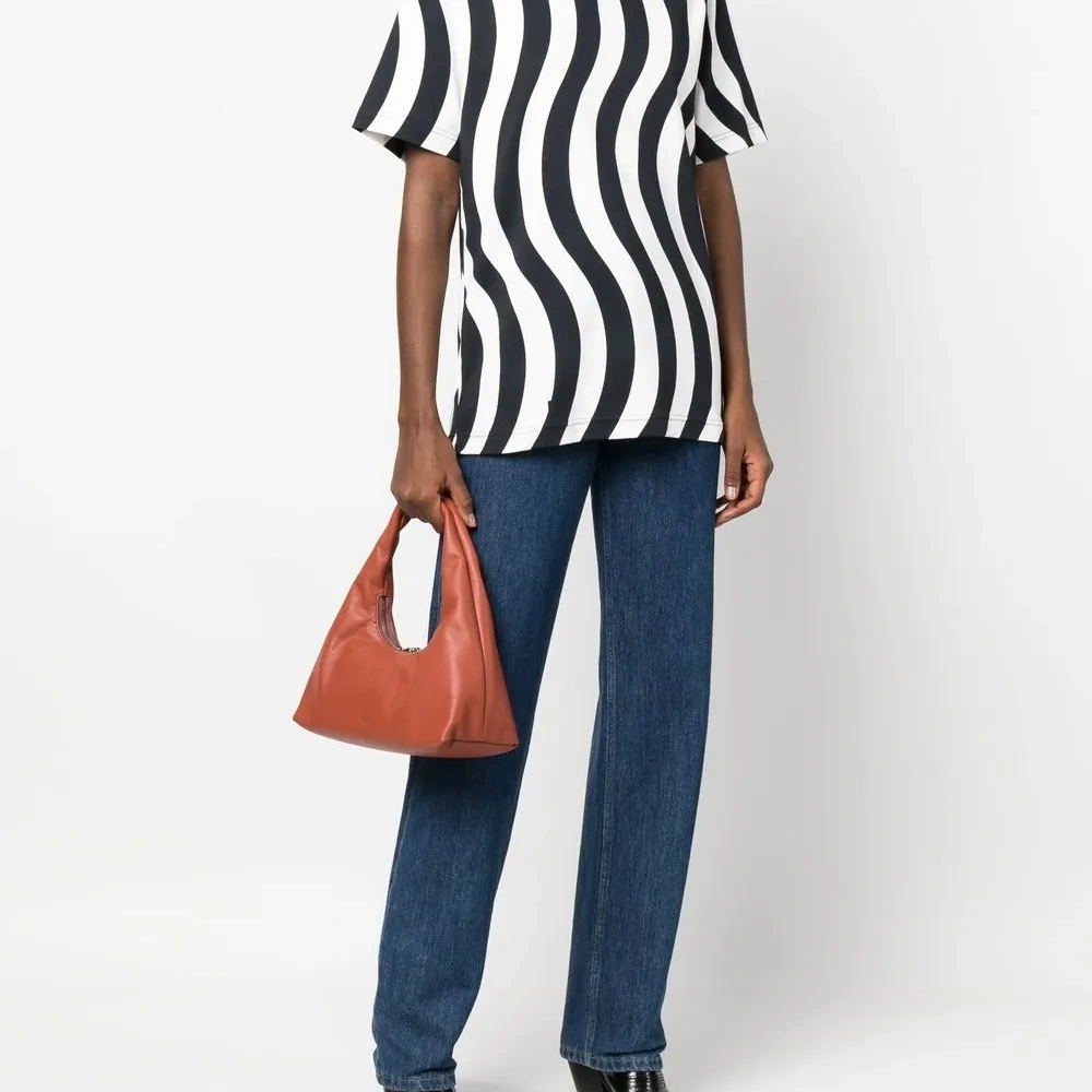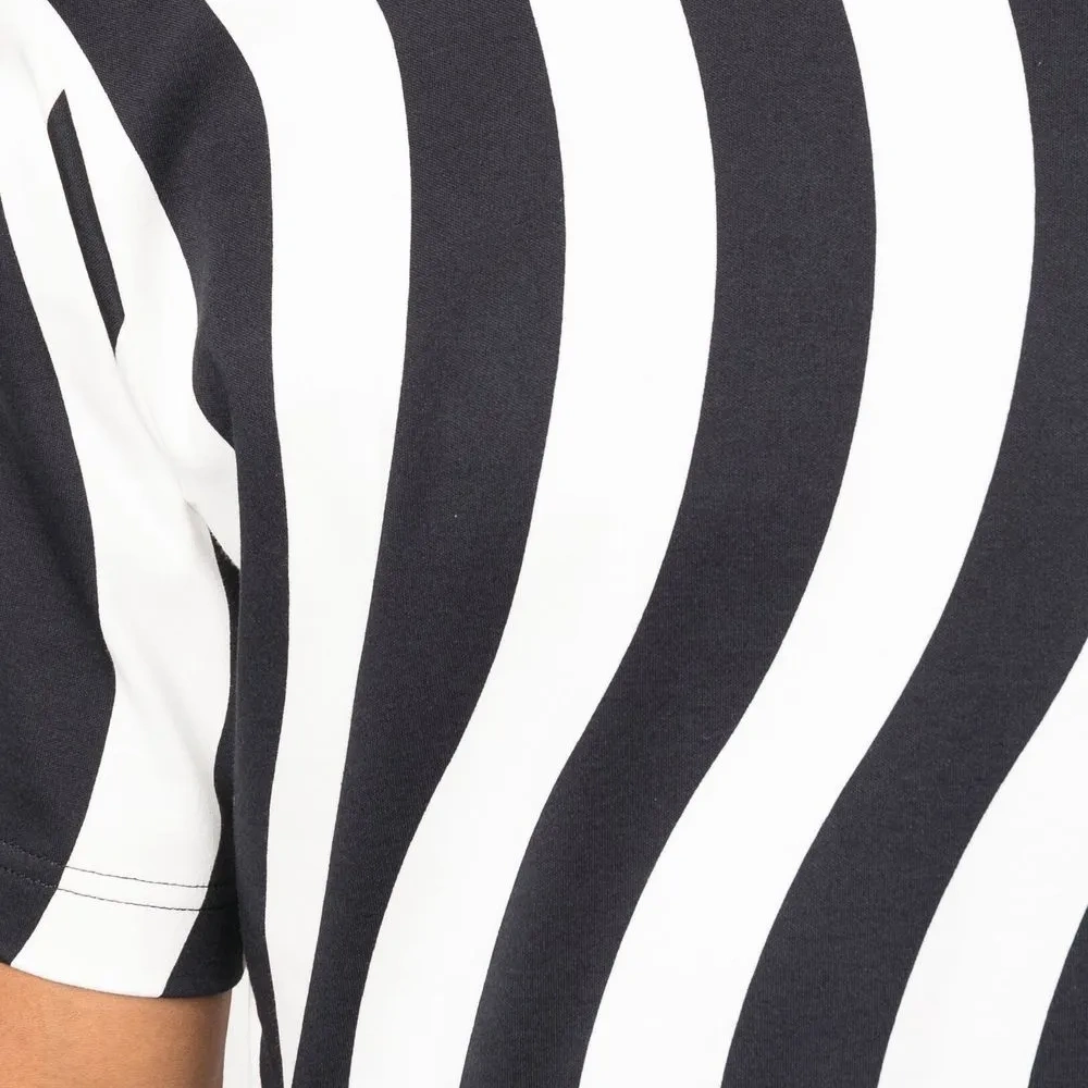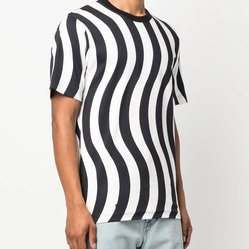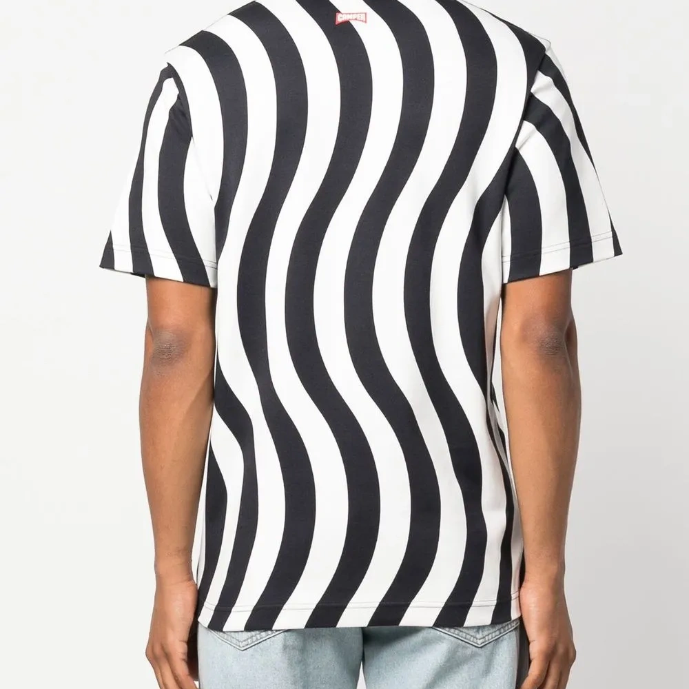 Черный/белый, хлопок, волнистый принт, круглый вырез, короткие рукава и прямой подол. Это унисекс-модель. Обратите внимание, что для нее используется мужская размерная сетка. Узнать больше о том, какие товары получают отметку «Ответственный выбор», можно из материала «Как мы оцениваем экологичность и этичность».