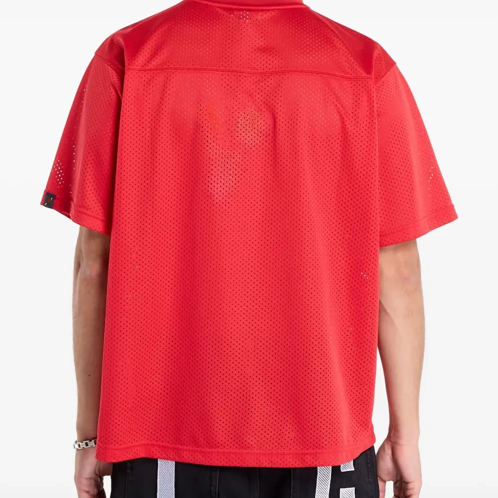 красная футболка с логотипом, короткими рукавами и круглым вырезом
