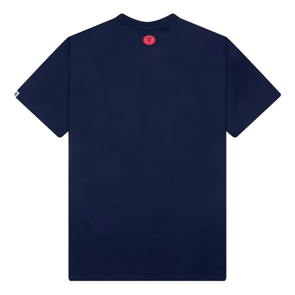 синяя футболка с графическим принтом, круглым вырезом, короткими рукавами и логотипом