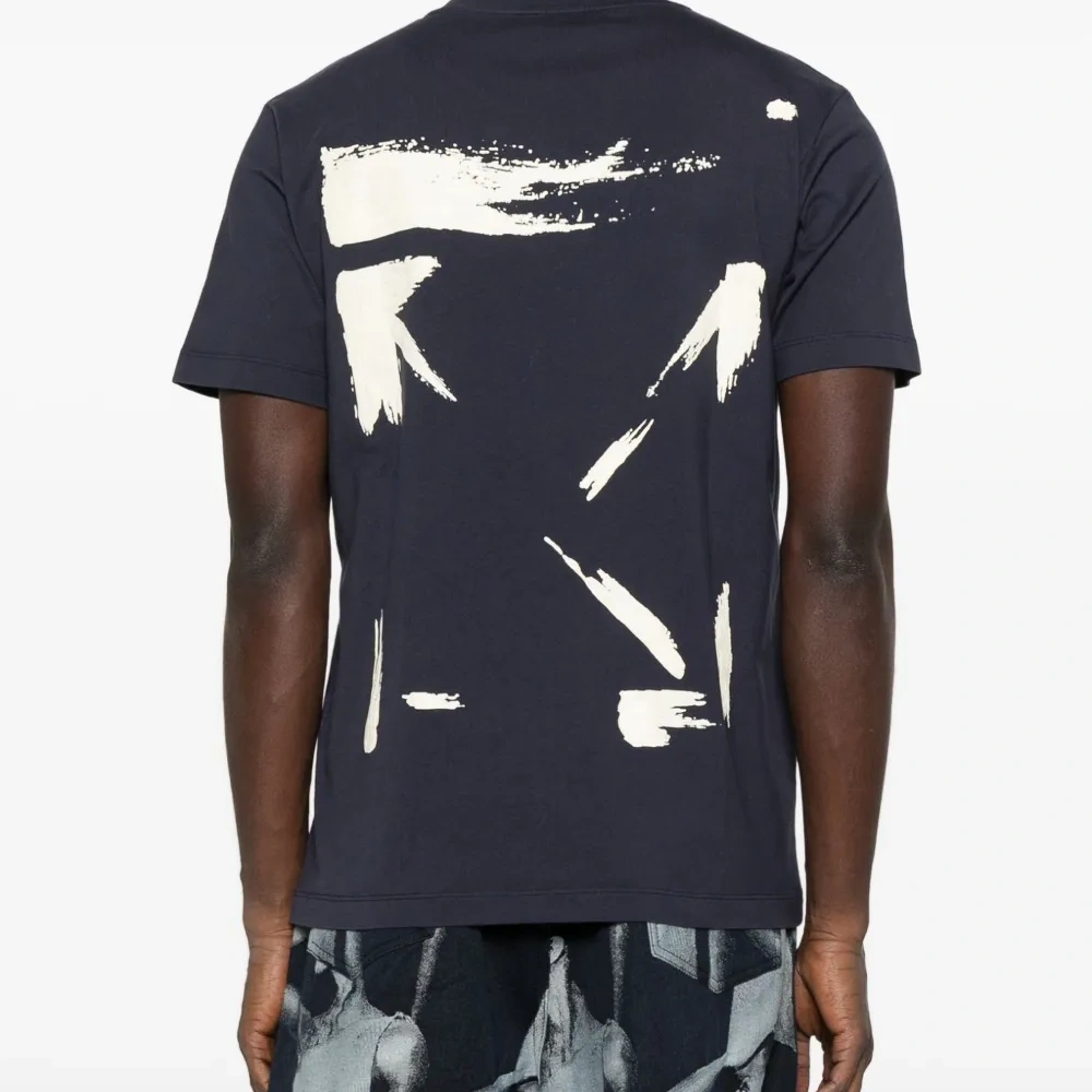 темно-синяя футболка с короткими рукавами, круглым вырезом, прямым подолом и логотипом