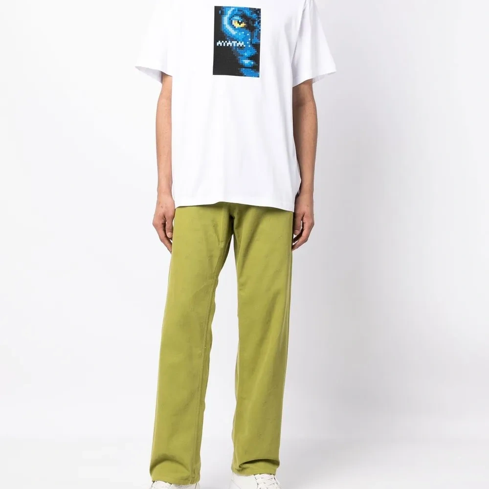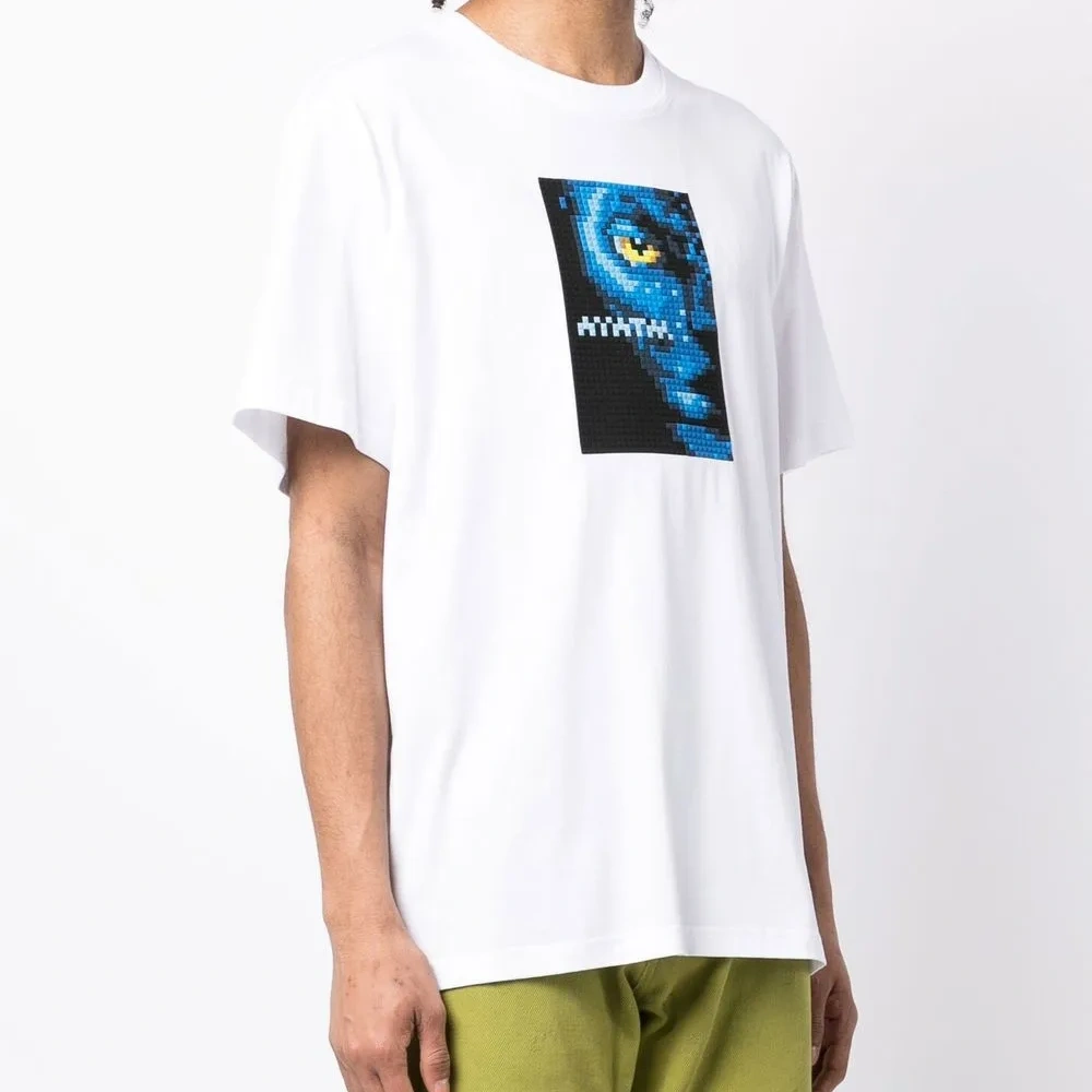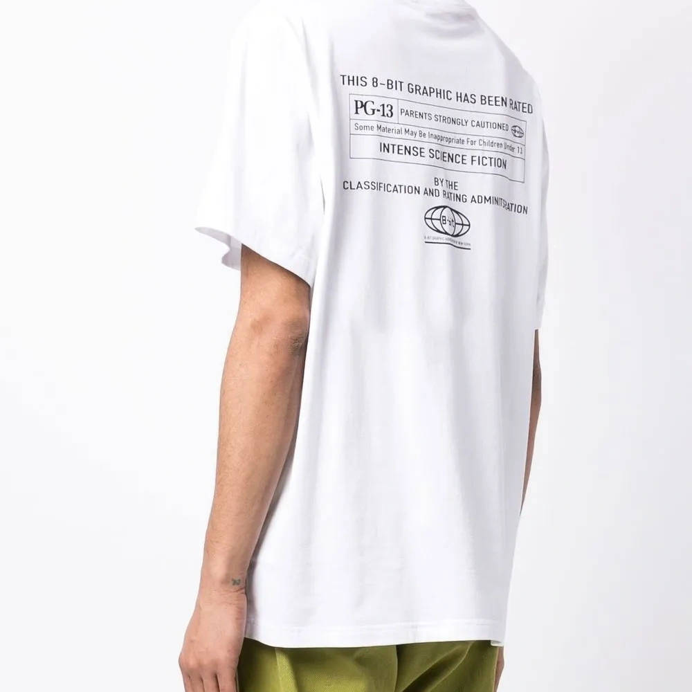 Хлопок, графичный принт спереди, принт с надписью сзади, круглый вырез, короткие рукава и прямой подол.
