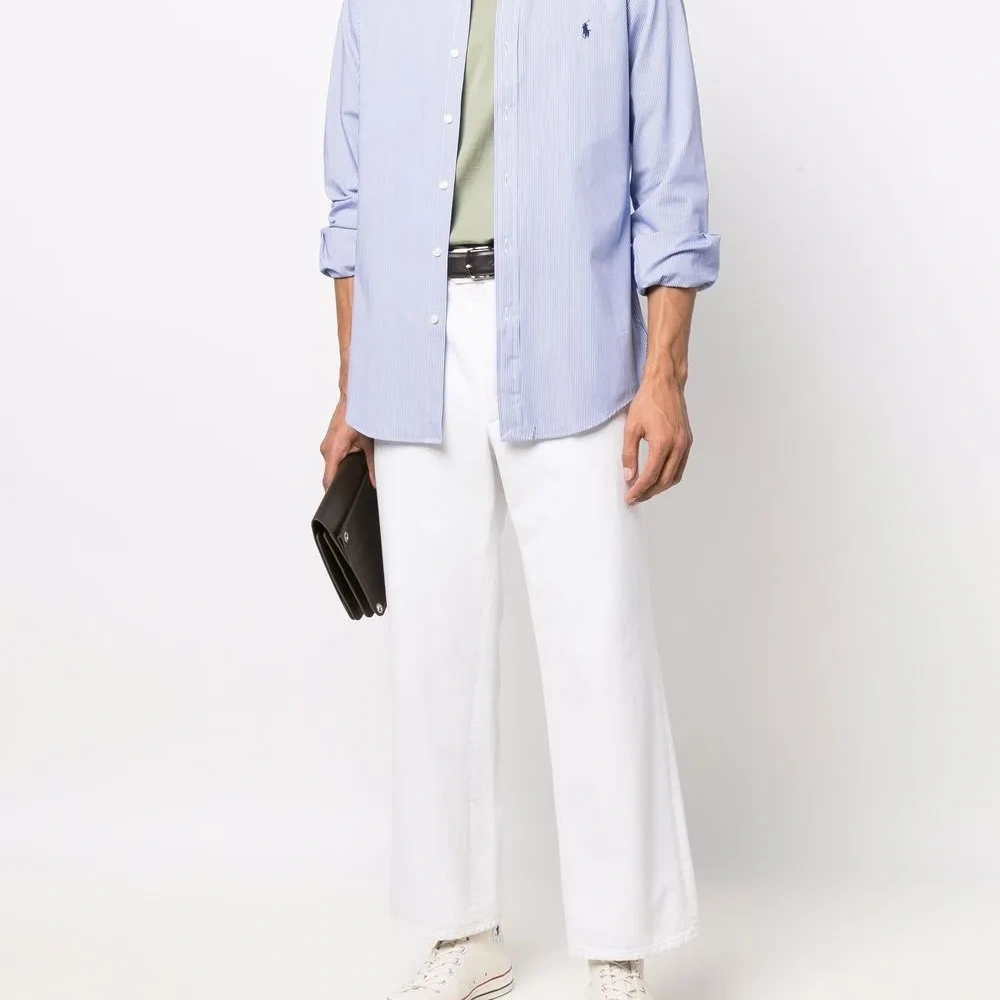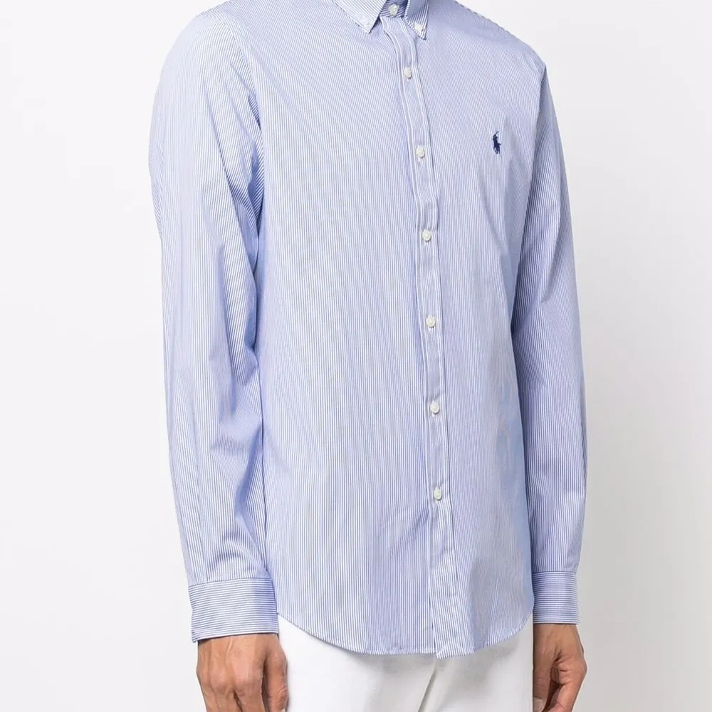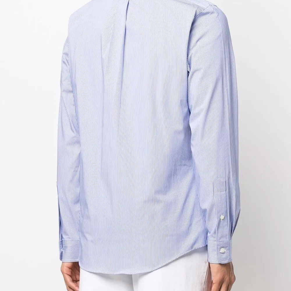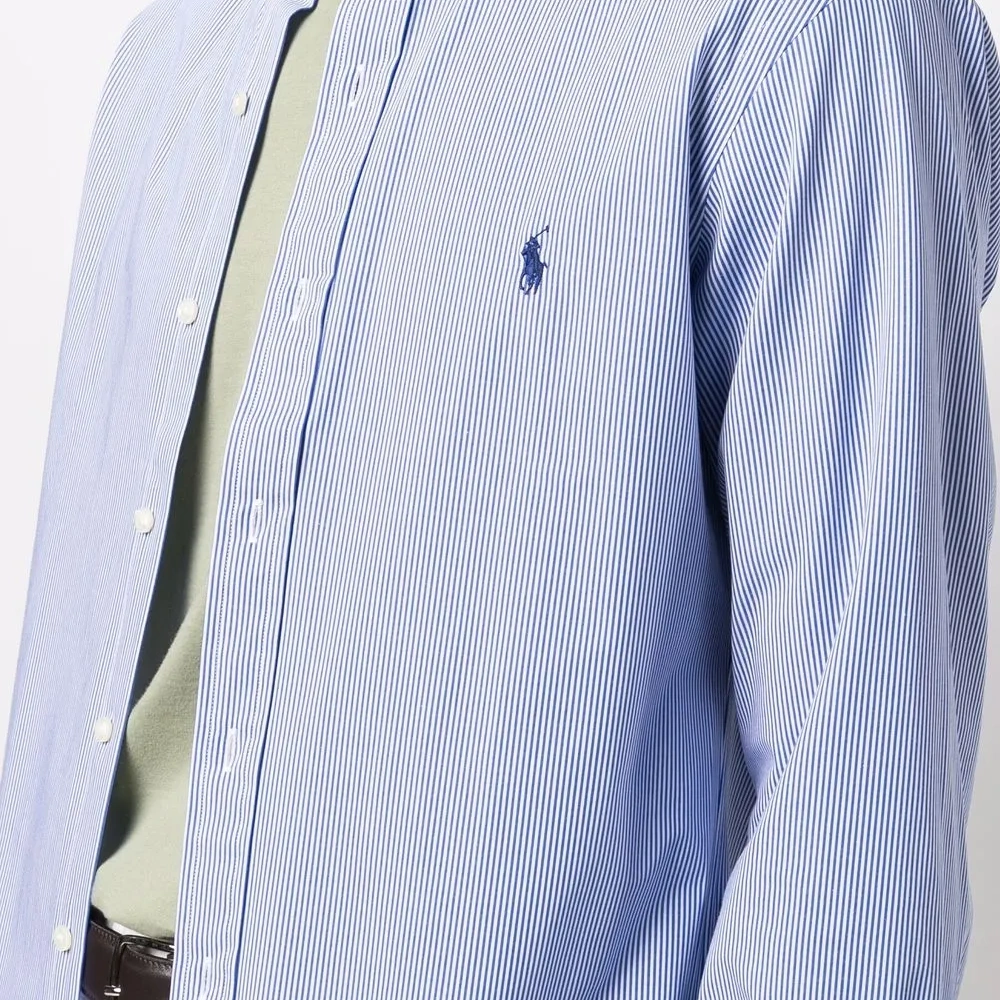 Вышитый логотип на груди, узор в полоску, воротник на пуговицах и длинные рукава. Цвет: синий.