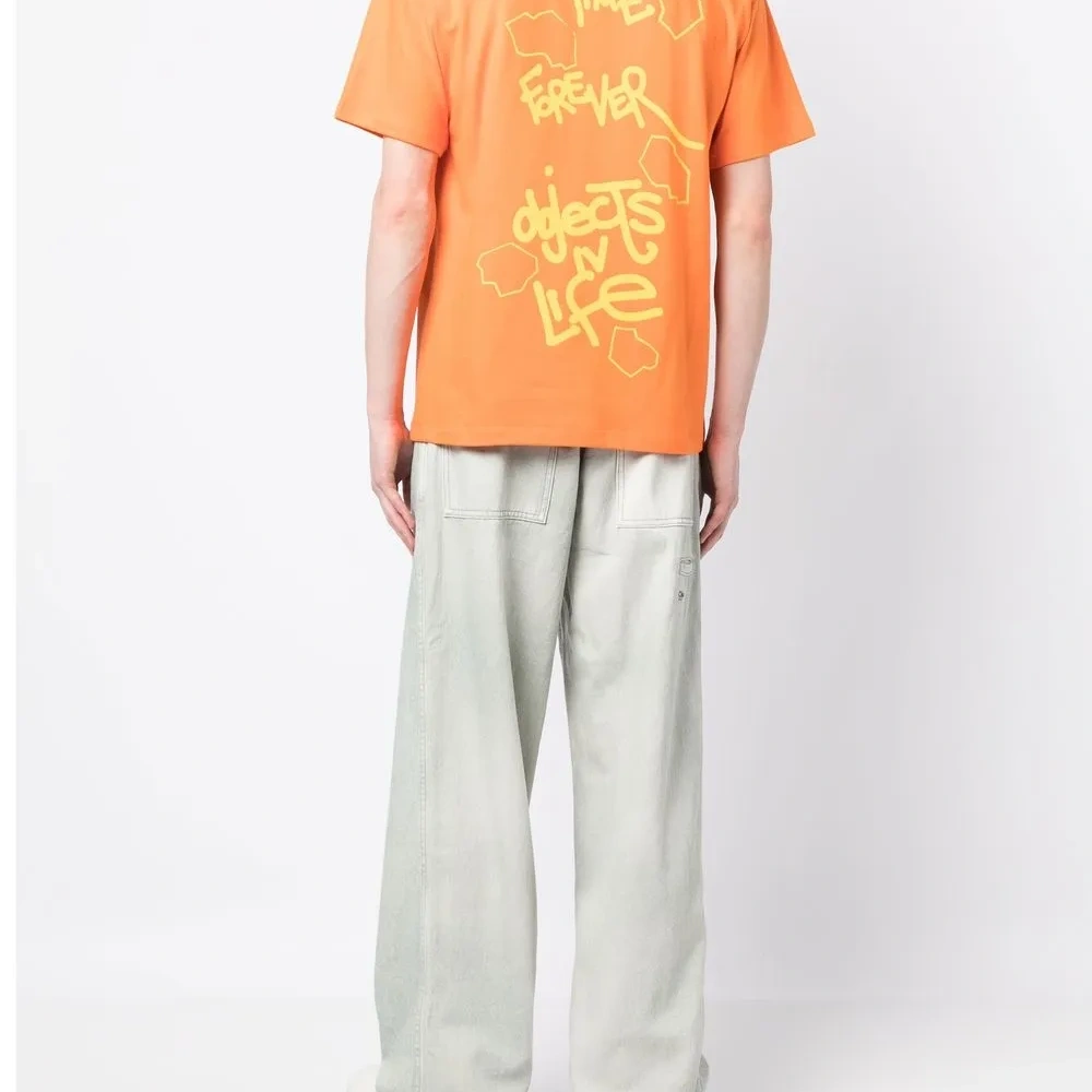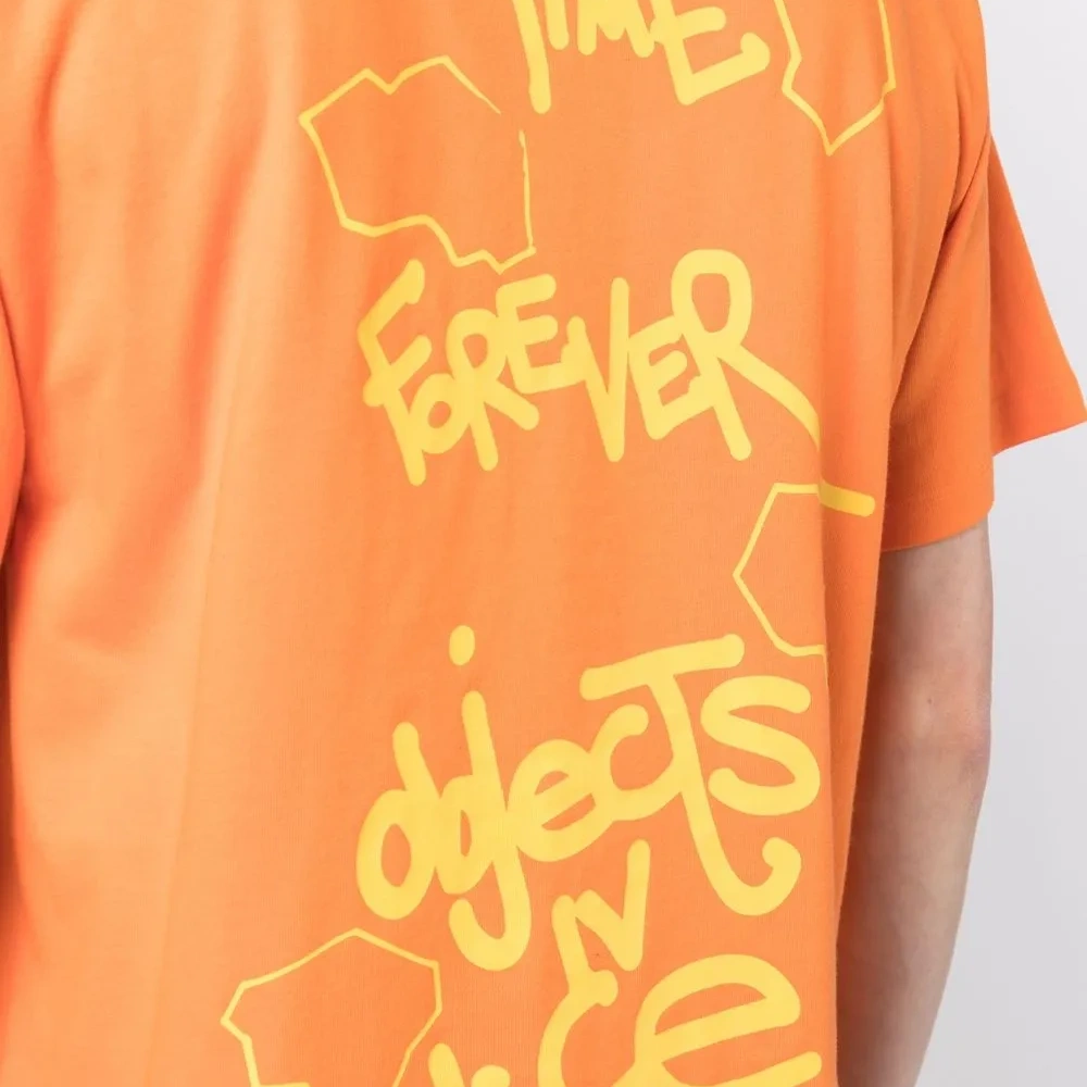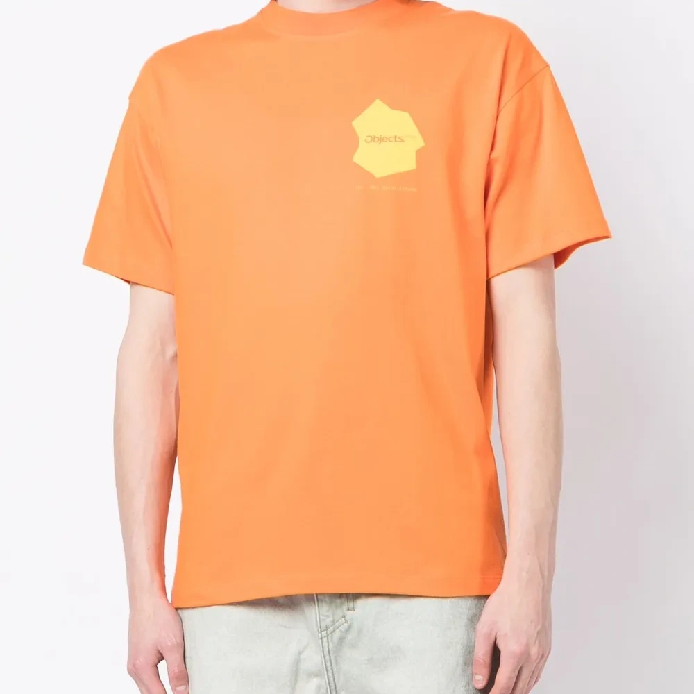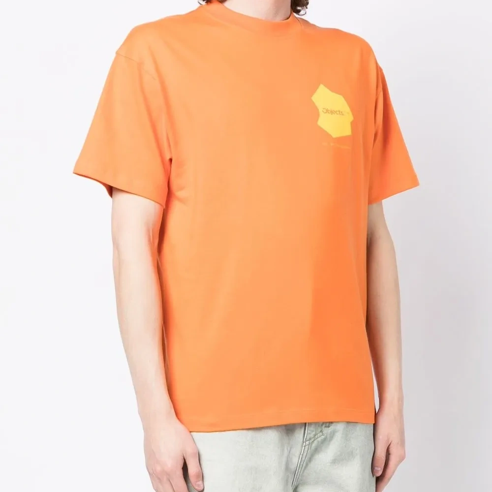 Морковный, хлопок, принт с надписью сзади, принт с логотипом на груди, круглый вырез, короткие рукава и прямой подол.