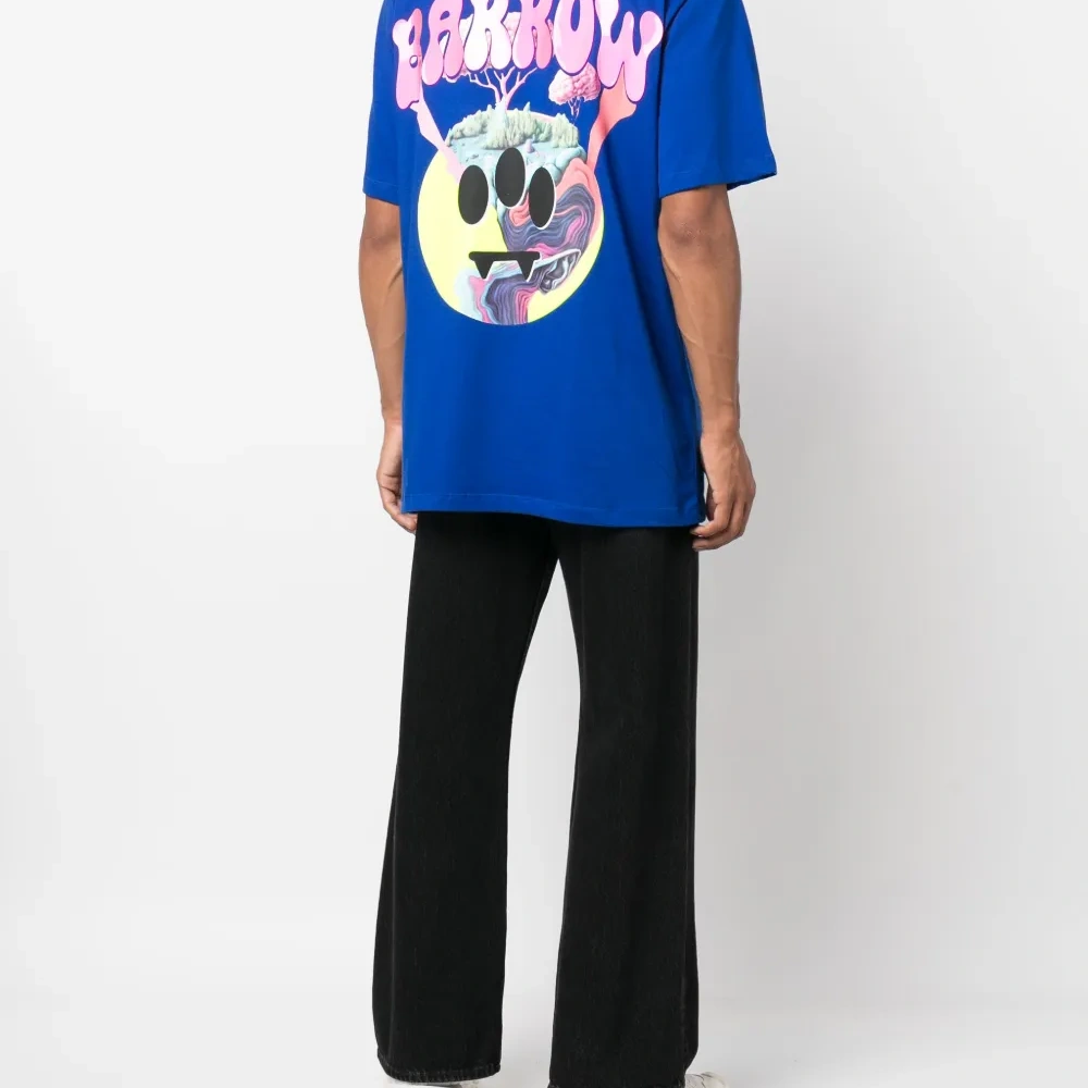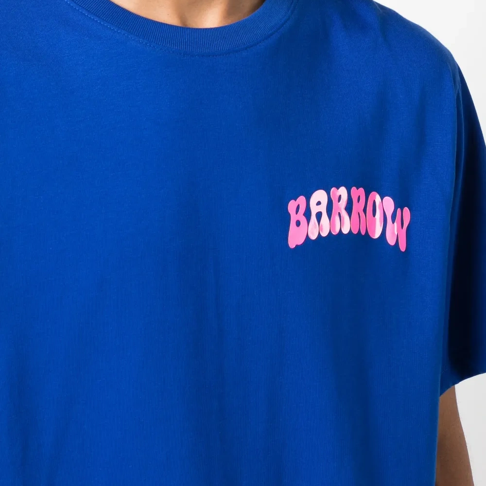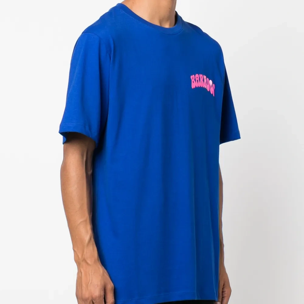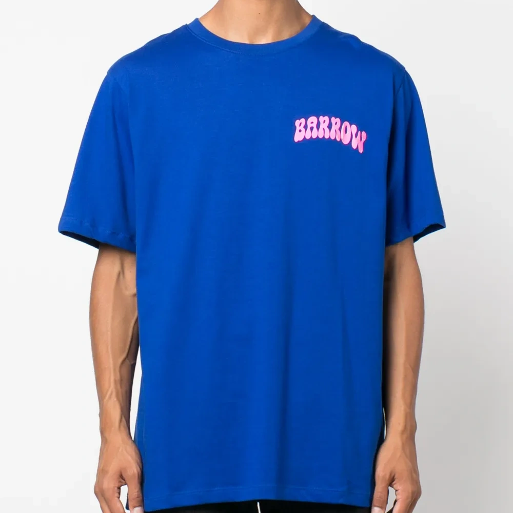 Синий, хлопок, принт с логотипом на груди, графичный принт на спине, круглый вырез, короткие рукава и прямой подол.