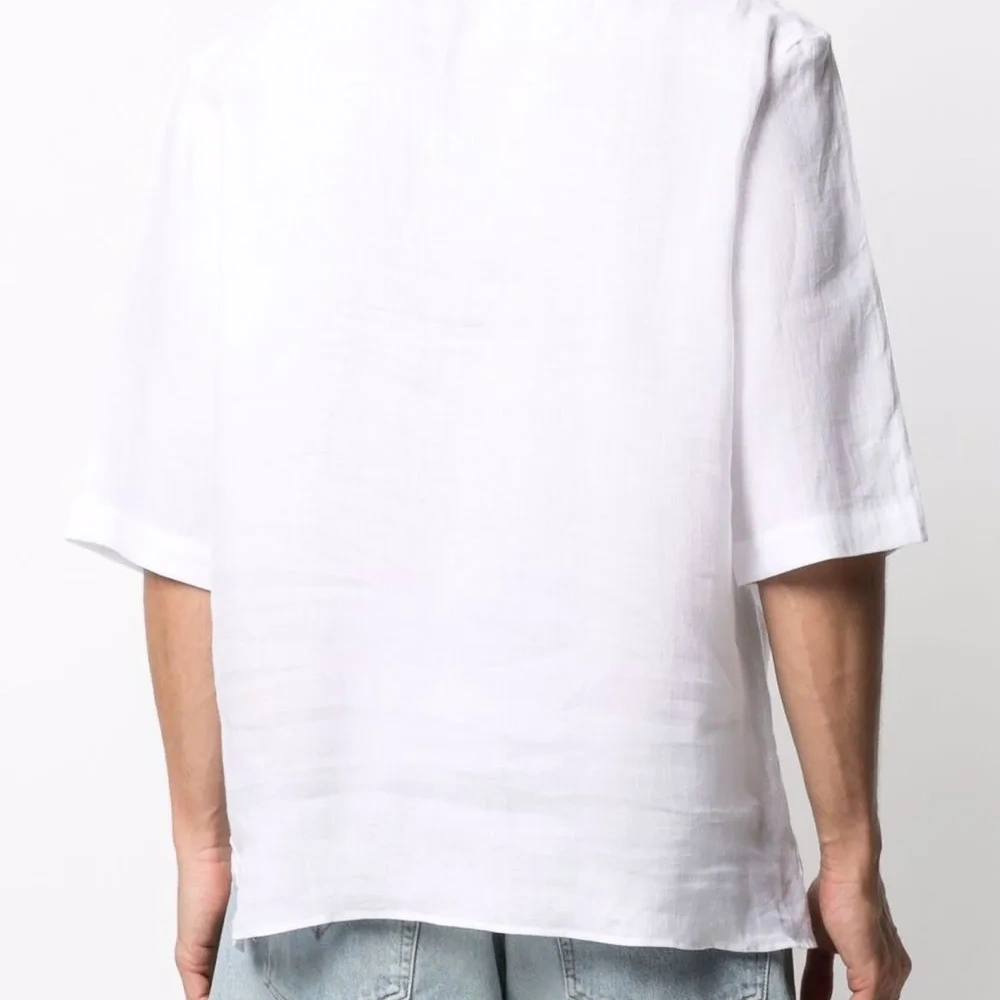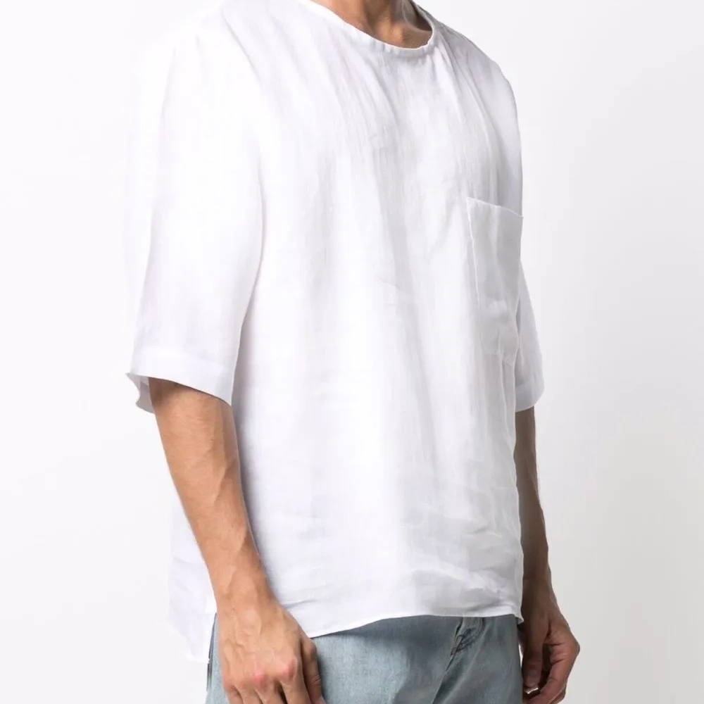 Нагрудный накладной карман, круглый вырез и короткие рукава. Цвет: белый. .