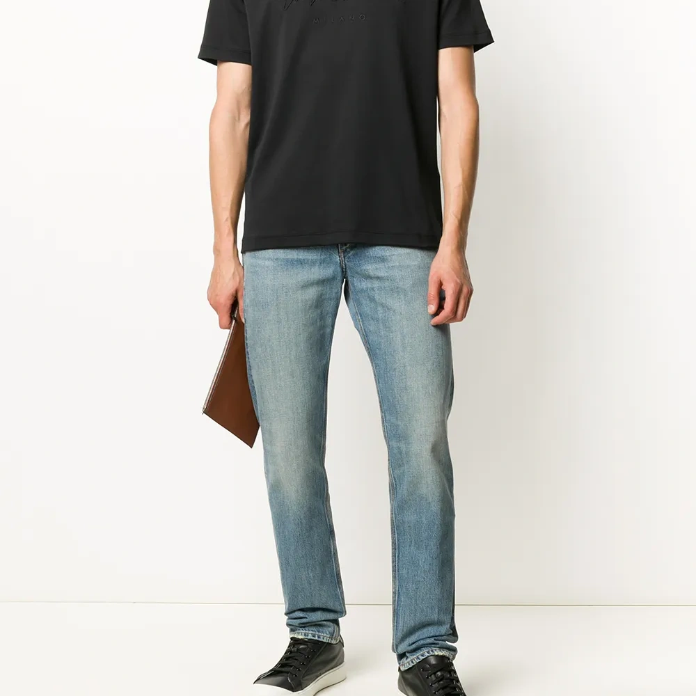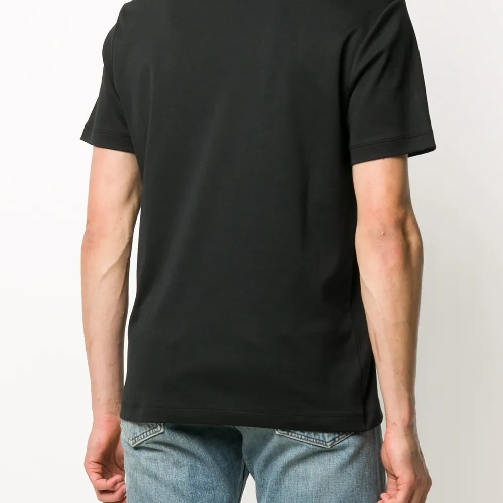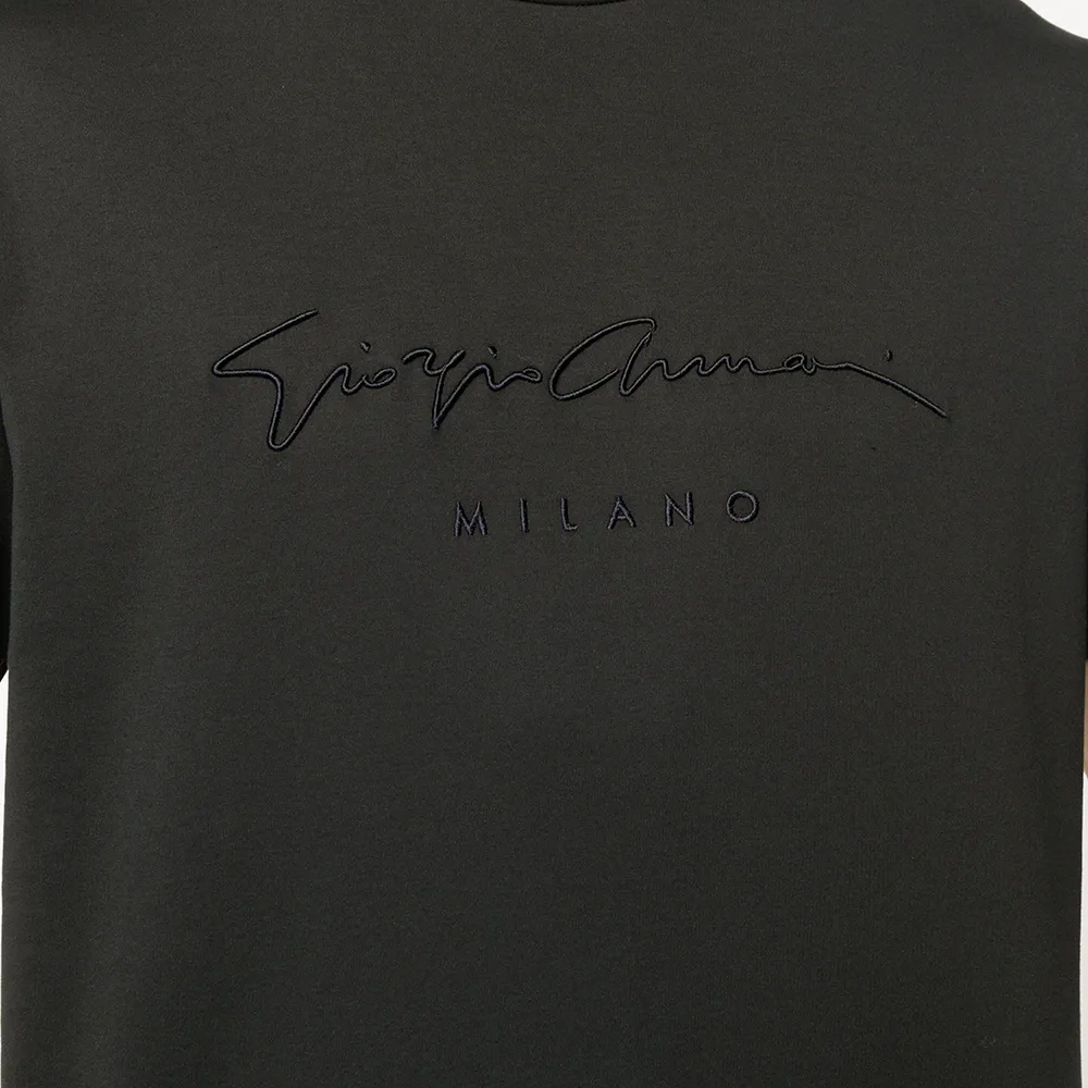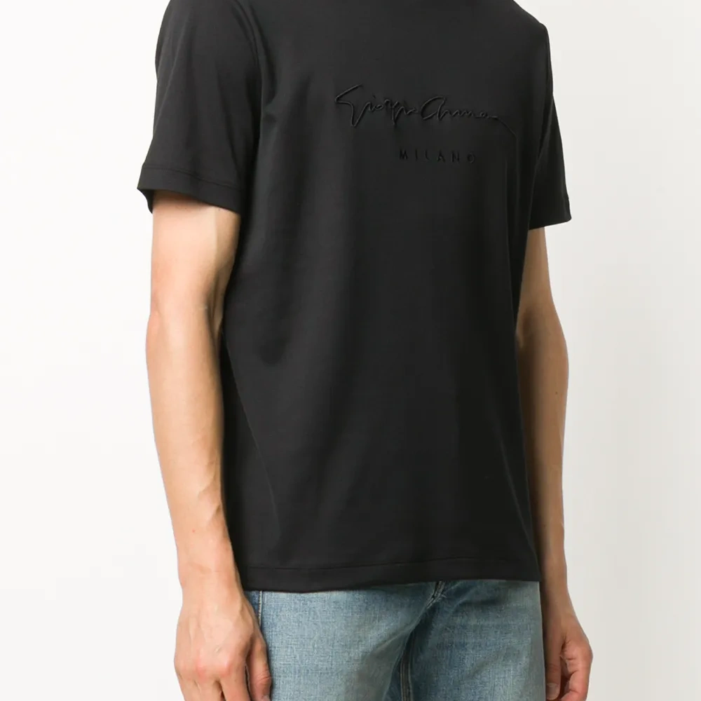 Футболка с вышитым логотипом от Giorgio Armani (Джорджо Армани). Круглый вырез, короткие рукава и прямой подол. Цвет: черный.