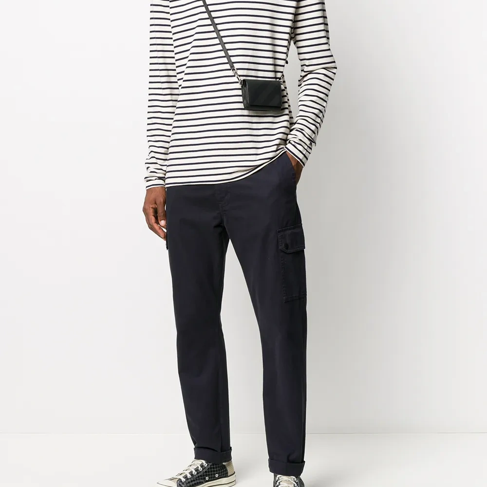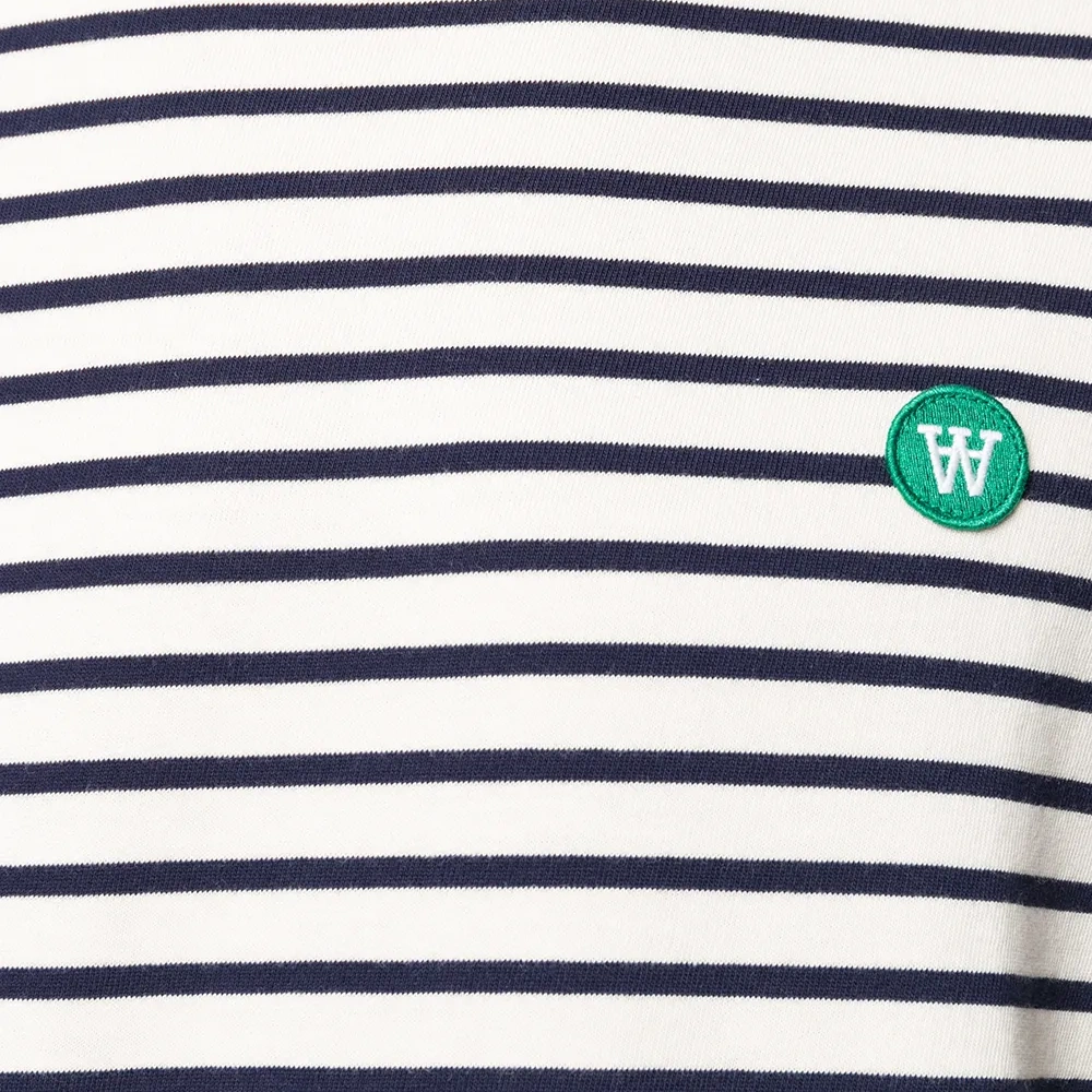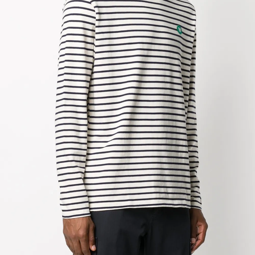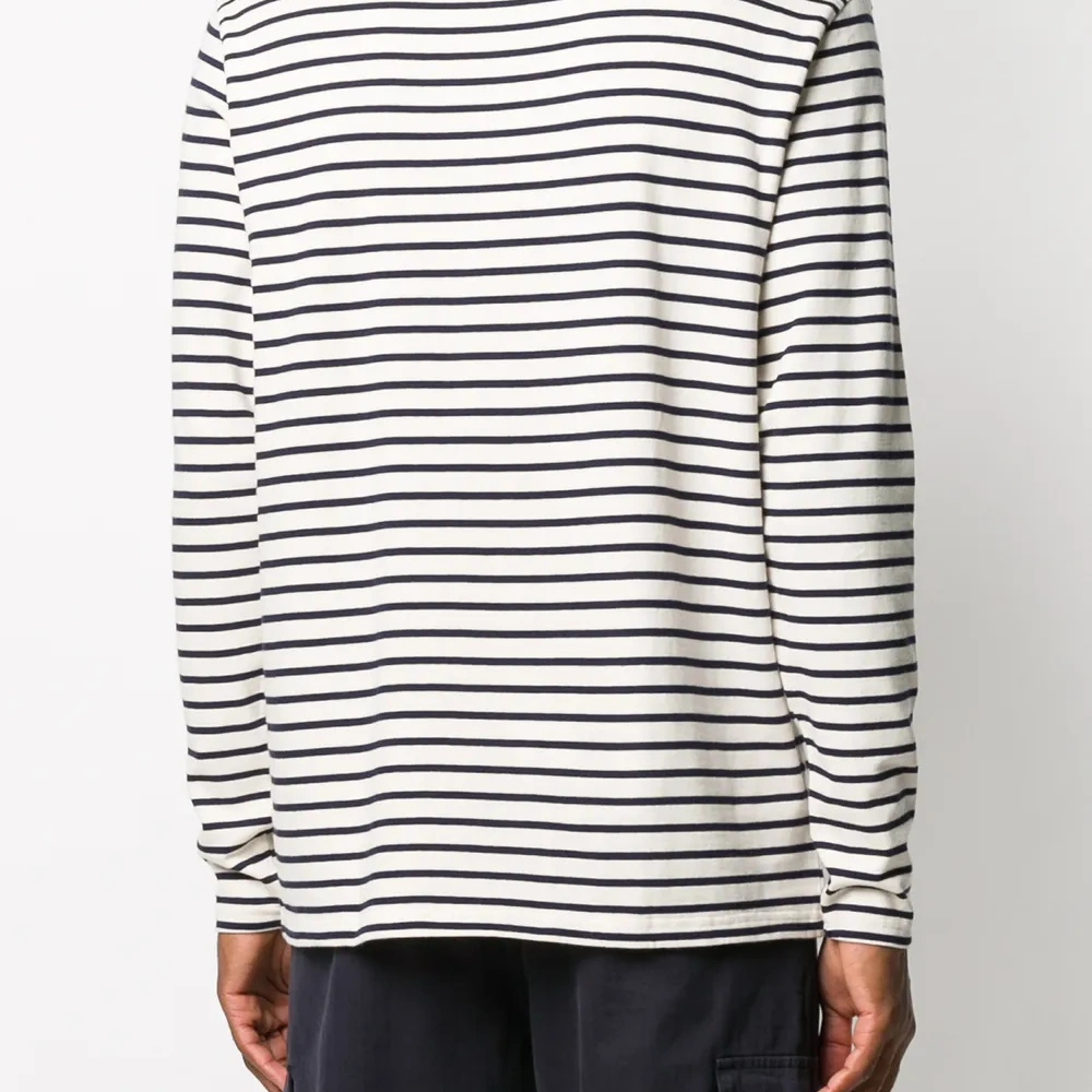 Ткань джерси, узор в горизонтальную полоску, вышитый логотип на груди, круглый вырез, длинные рукава и прямой подол.
